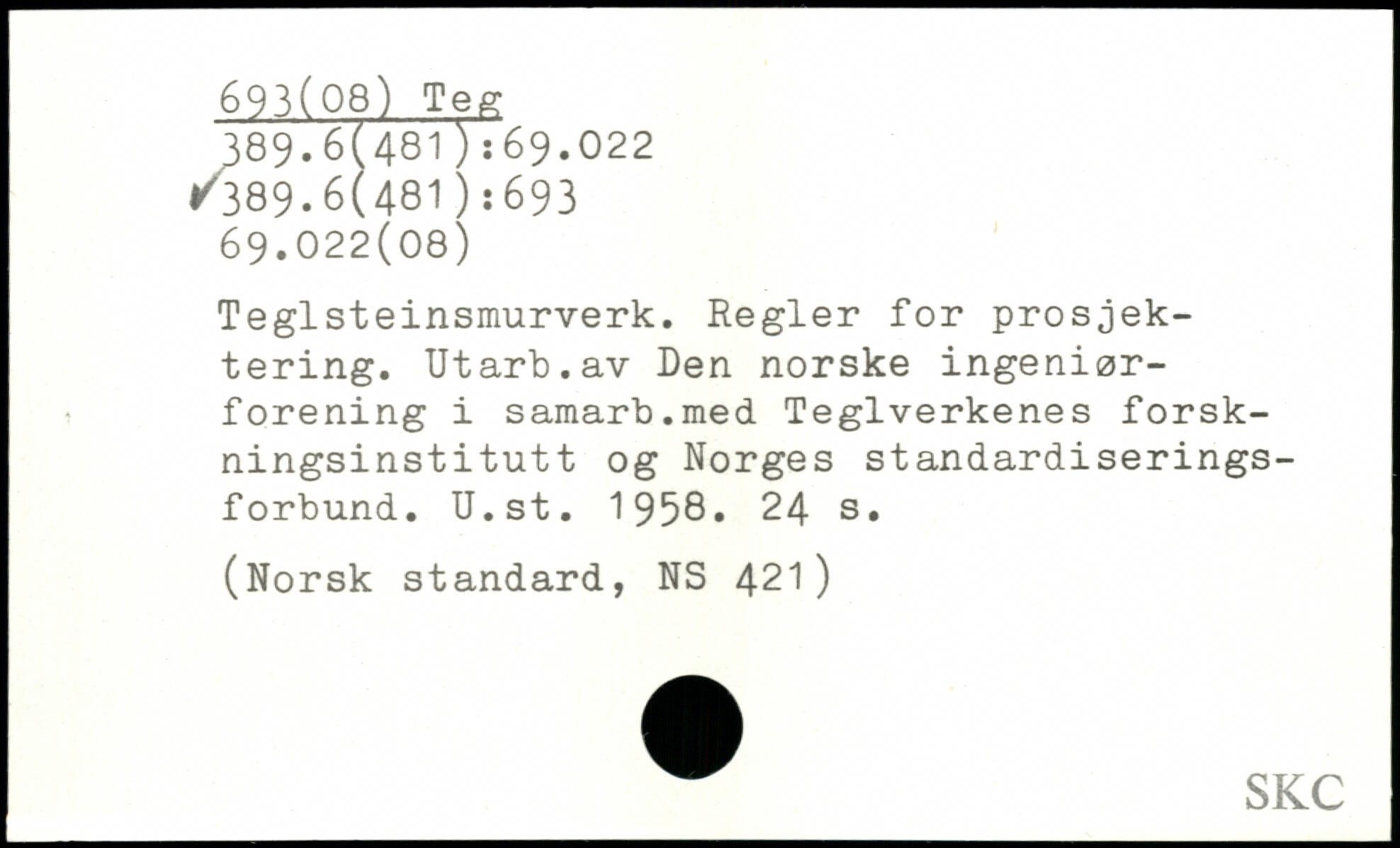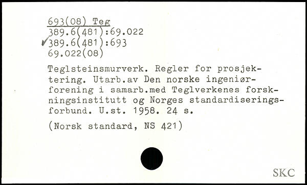 Teglsteinsmurverk. Regler for prospektering. Utarb.av Den norske ingeniørforening i samarb.med Teglverkenes forskningsinsti tutt og Norges standardiseringsforbund. U.st. 1958.