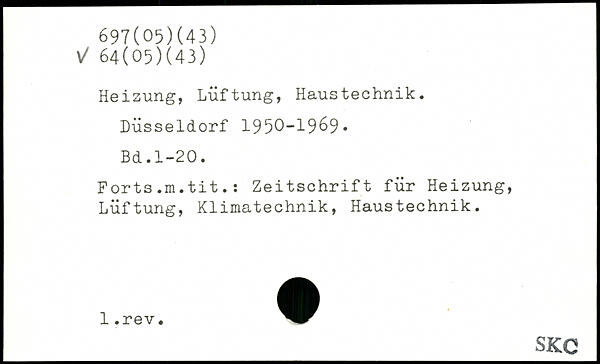 Heizung, Lüftung, Haustechnik. Düsseldorf 1950-1969. Forts.m.tit.: Zeitschrift für Heizung, Lüftung, Klimatechnik, Haustechnik.