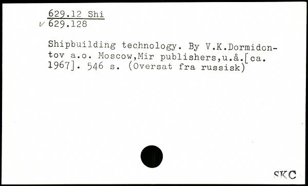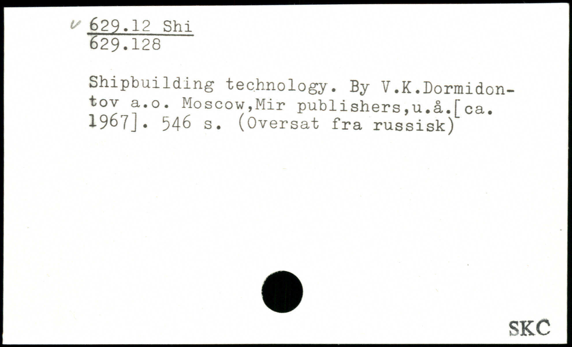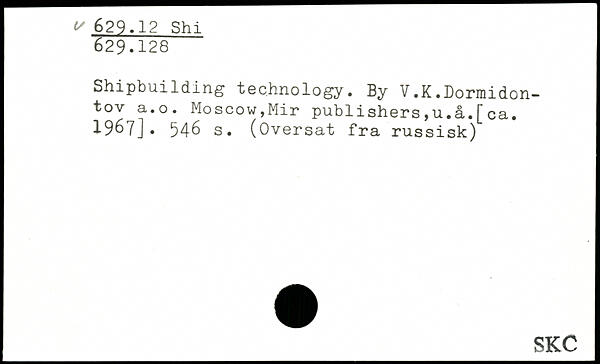 Shipbuilding technology. By V.K.Dormidon-tov a.o. Moscow,Mir publishers,u.a.[ca. 1967].