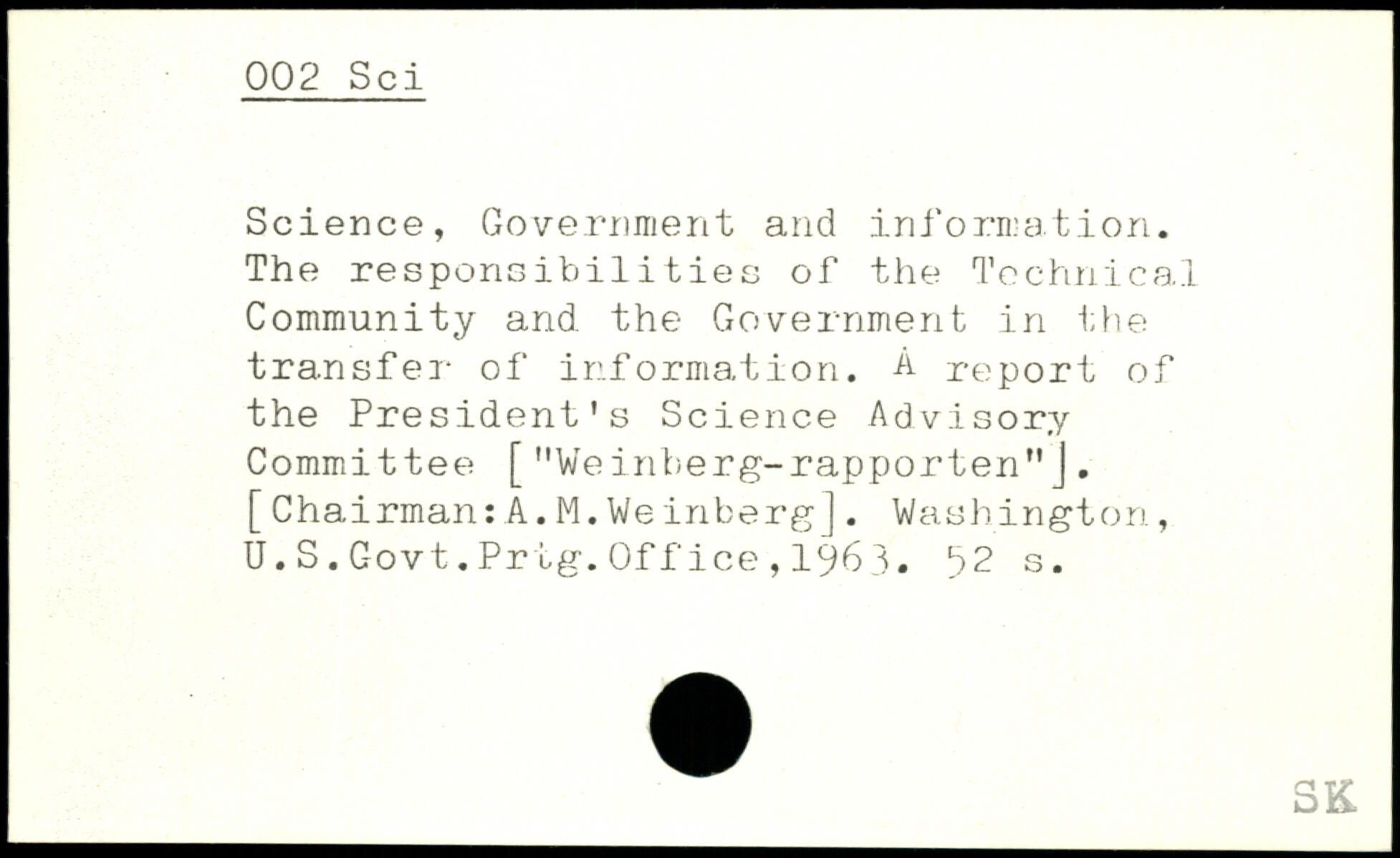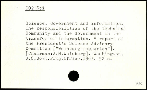 Science, Government and information. The responsibilities of the Technical Community and the Government in the transfer of information. A report of the President’s Science Advisory Committee ["Weinberg-rapporten"J.