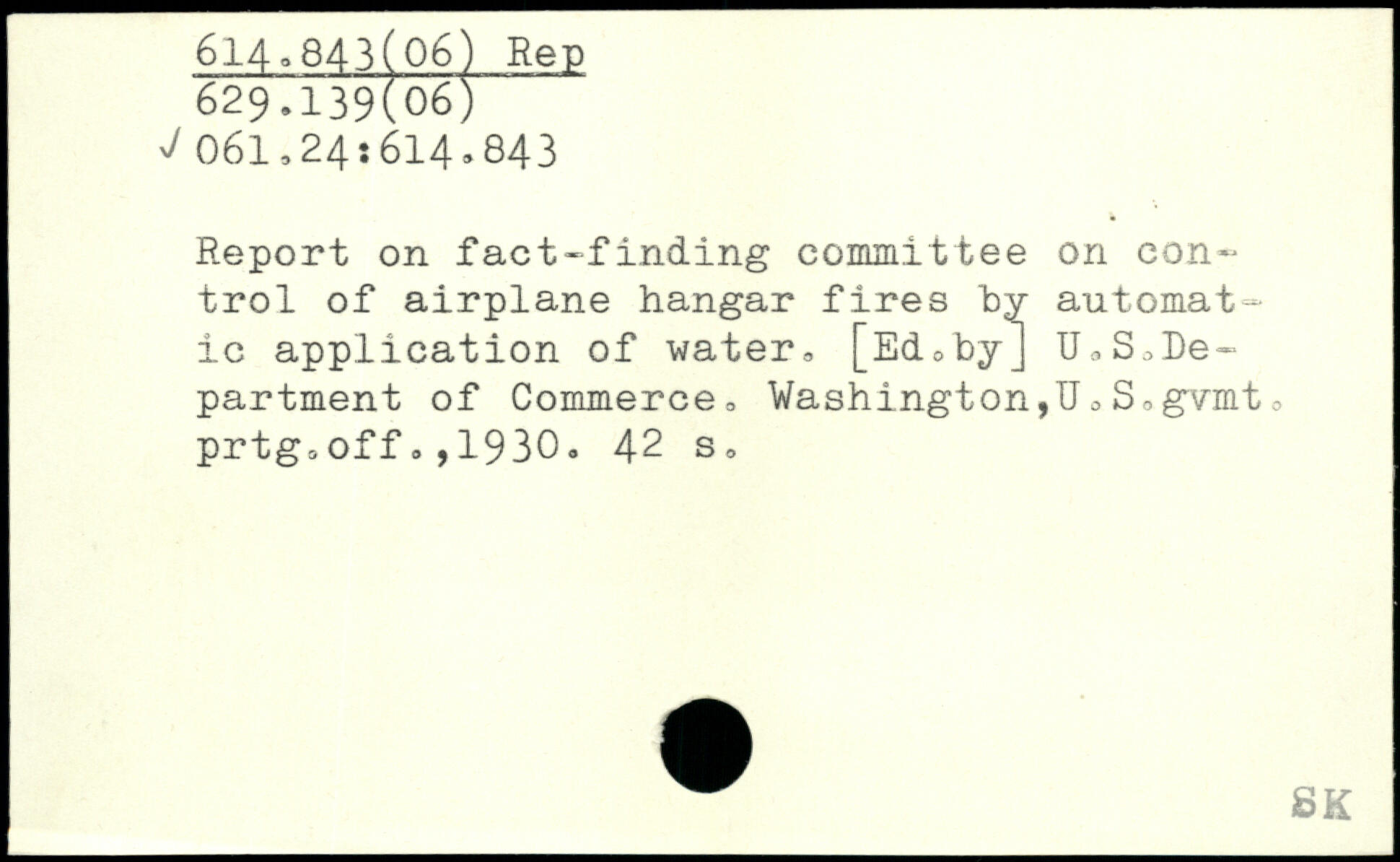 Report on fact-finding committee on control of airplane hangar fires by automatic application of water, [Edoby] TJ0S,Department of Commerce, Washington,!!