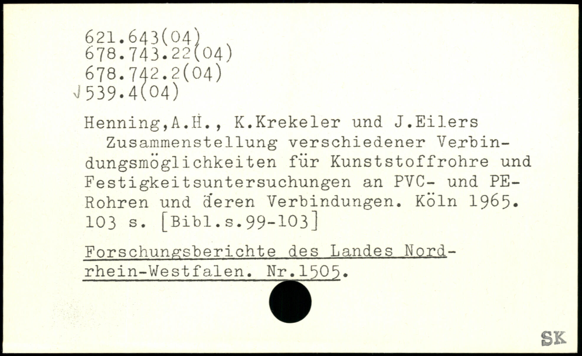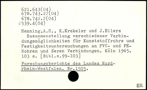 Henning,A.H., K.Krekeler und J.Eilers Zusammenstellung verschiedener Verbin-dungsmöglichkeiten für Kunststoffrohre und Festigkeitsuntersuchungen an PVC- und PE-Rohren und Üeren Verbindungen.