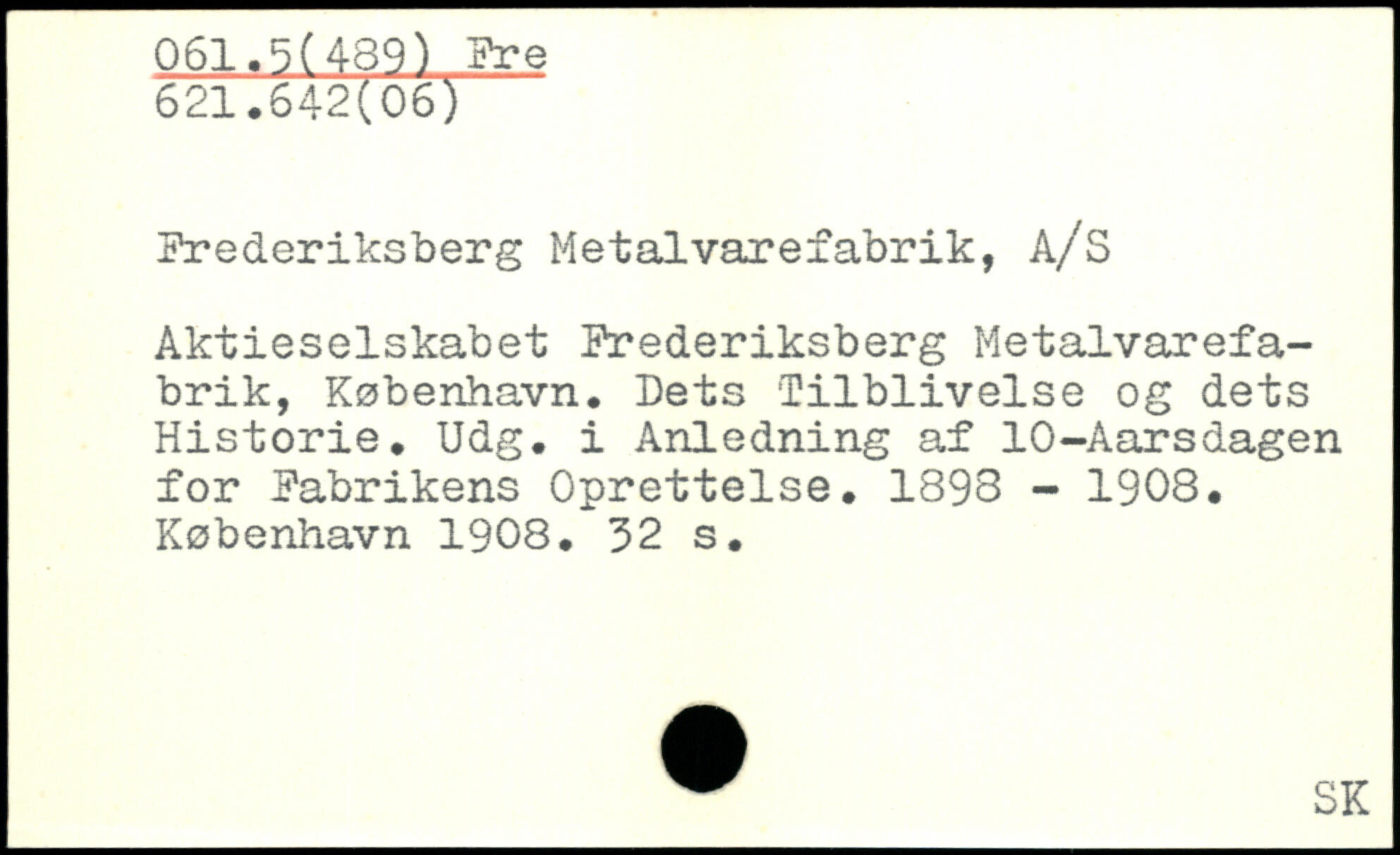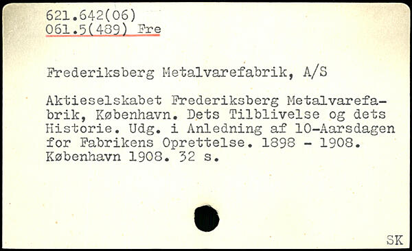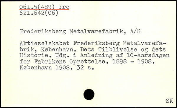 Frederiksberg Metalvarefabrik, A/S Aktieselskabet Frederiksberg Metalvarefabrik, København. Dets Tilblivelse og dets Historie. Udg. i Anledning af 10-Aarsdagen for Fabrikens Oprettelse. 1898 - 1908.