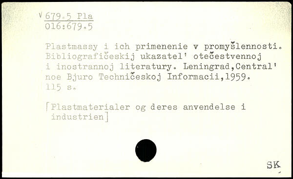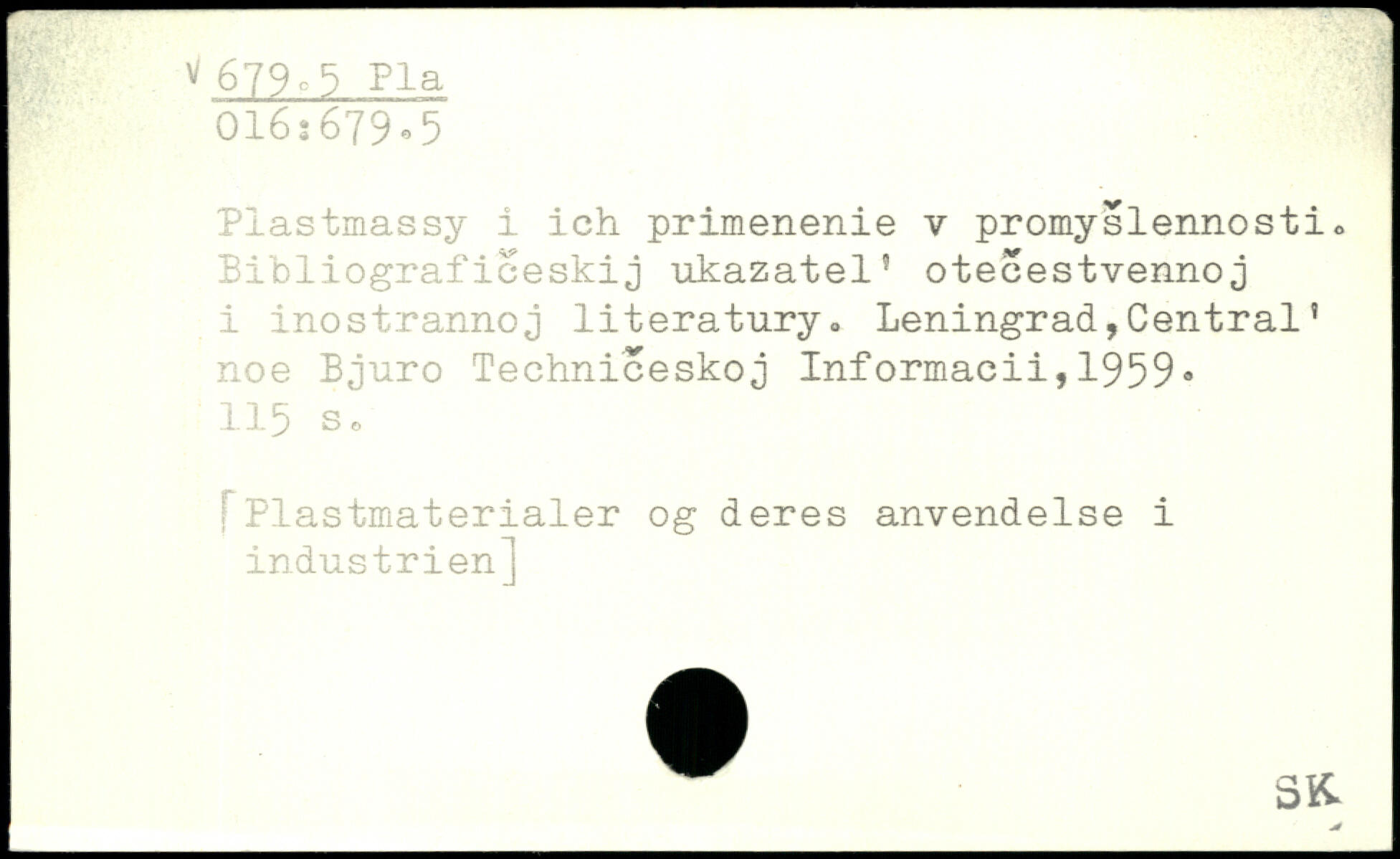 Piastmassy i ich primenenie v promyslennosti <> Bibliograficeskij ukazatel’ otecestvennoj i inostrannoj literatury. Leningrad,Central’ noe Bjuro Techniceskoj Informacii,1959