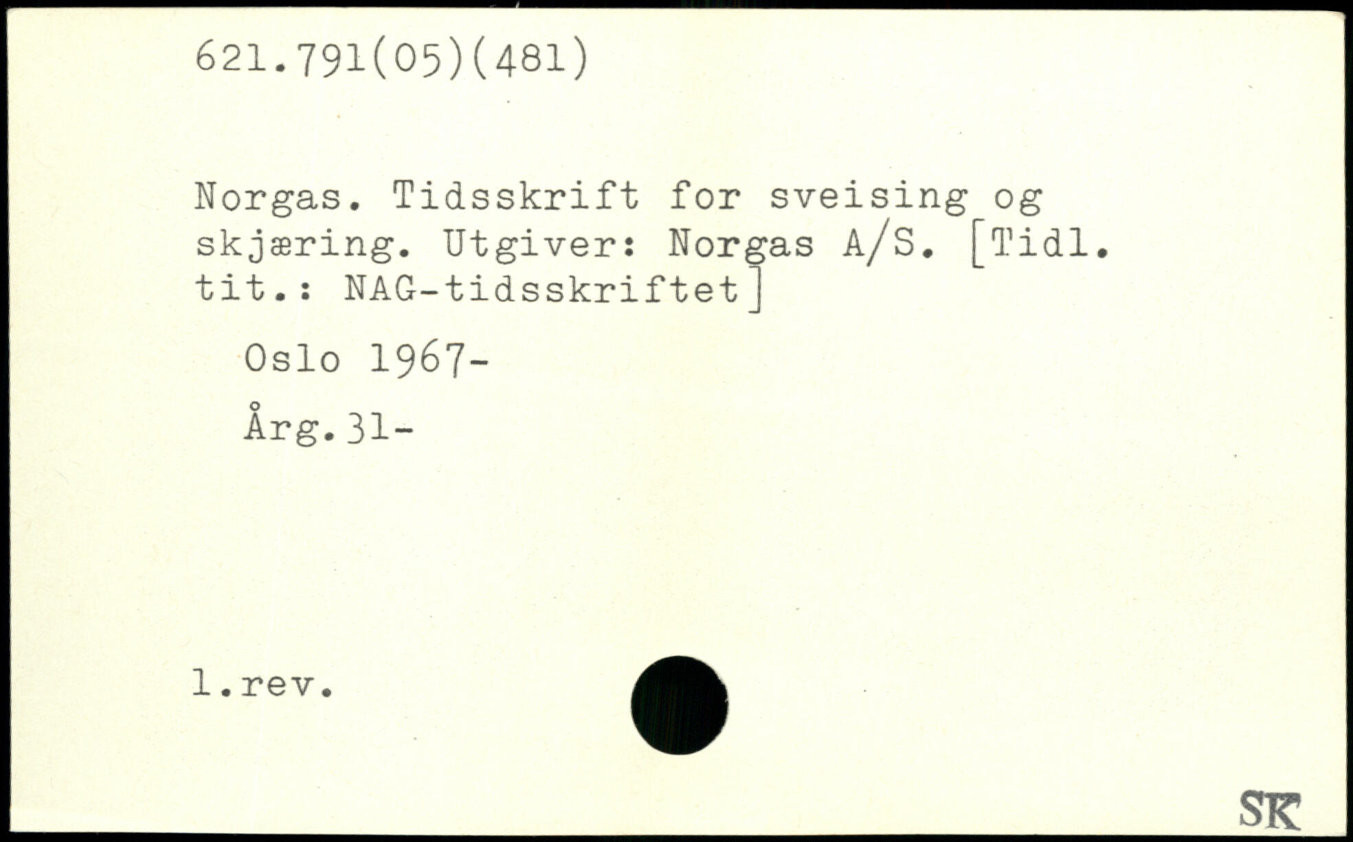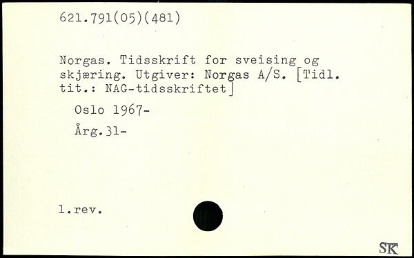 Norgas. Tidsskrift for sveising og skjæring. Utgiver: Norgas a/S. [Tidl. tit.: NAG-tidsskriftet] Oslo 1967-Årg.31-