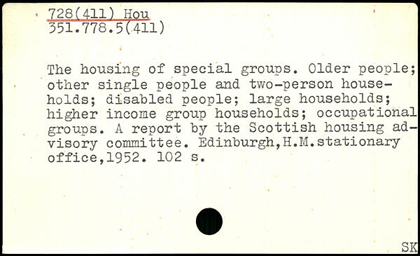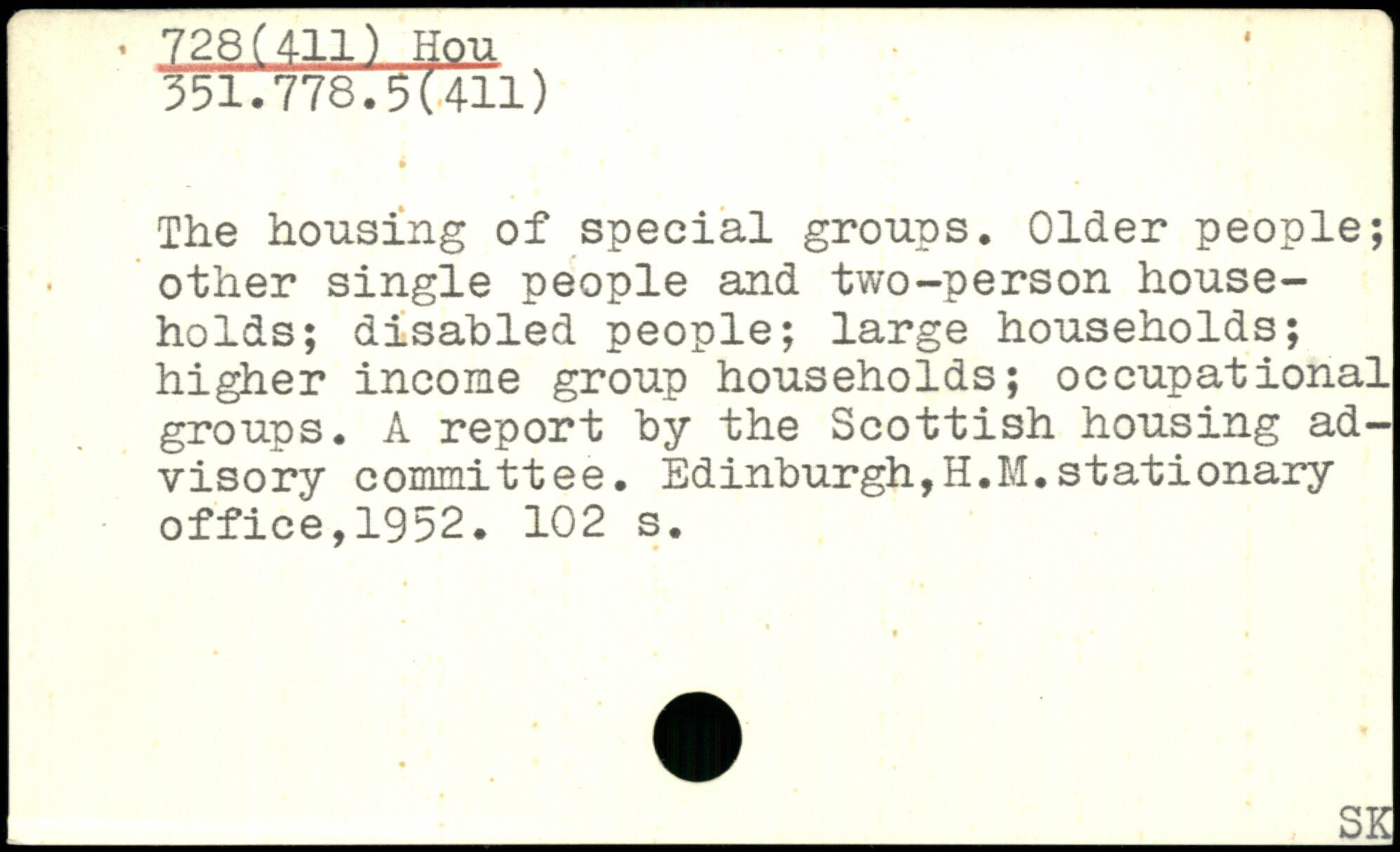 The housing of special groups. Older people; other single people and two-person households; disabled people; large households; higher income group households; occupational groups. A report by the Scottish housing advisory committee. Edinburgh,H.M.stationary office,1952.