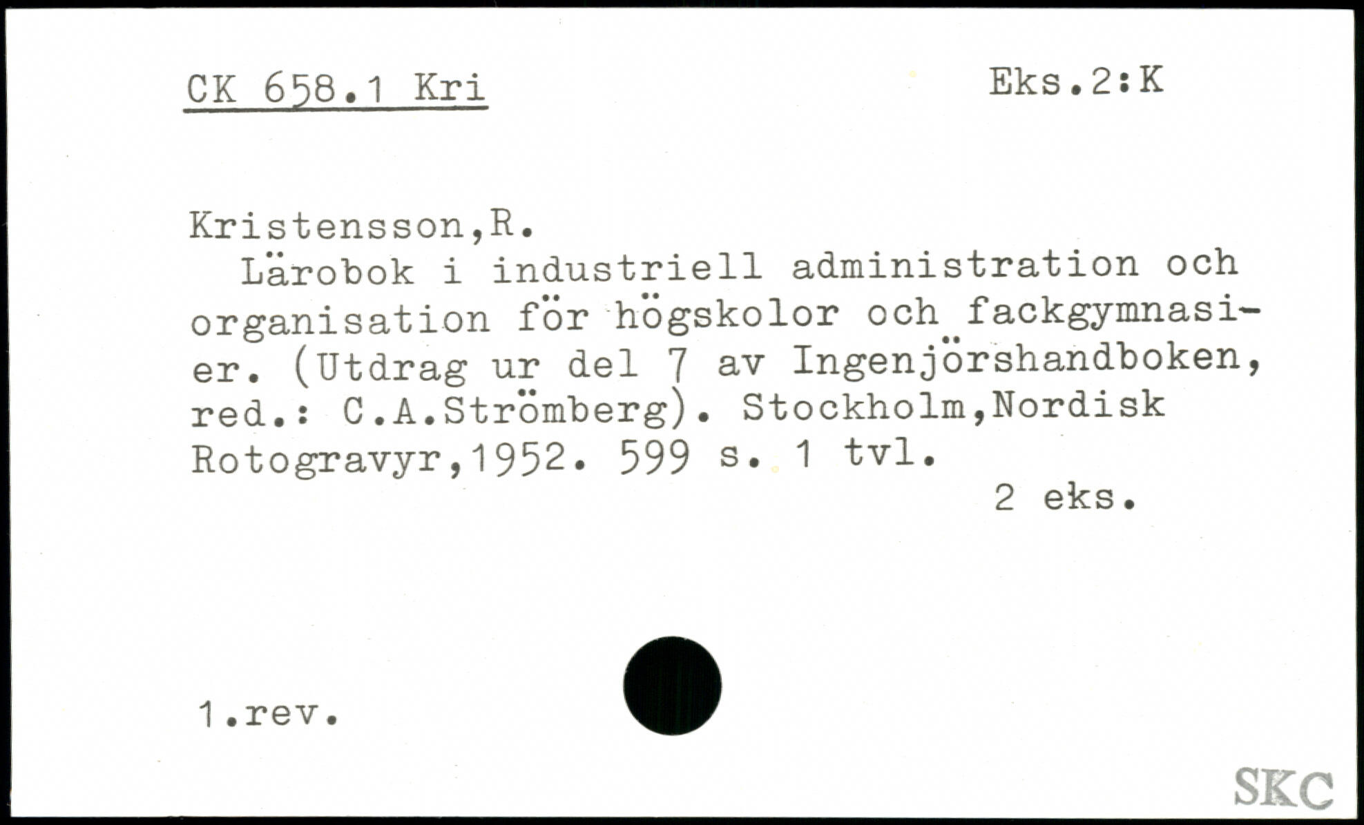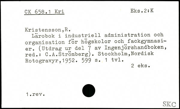 Lärobok i industriell administration och organisation for hogskolor och^fackgymnasi— er. (Utdrag ur del 7 av Ingenjörshandboken, red.: C.A.Strömberg).