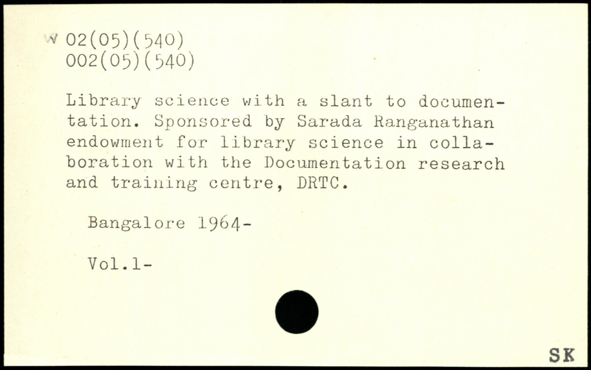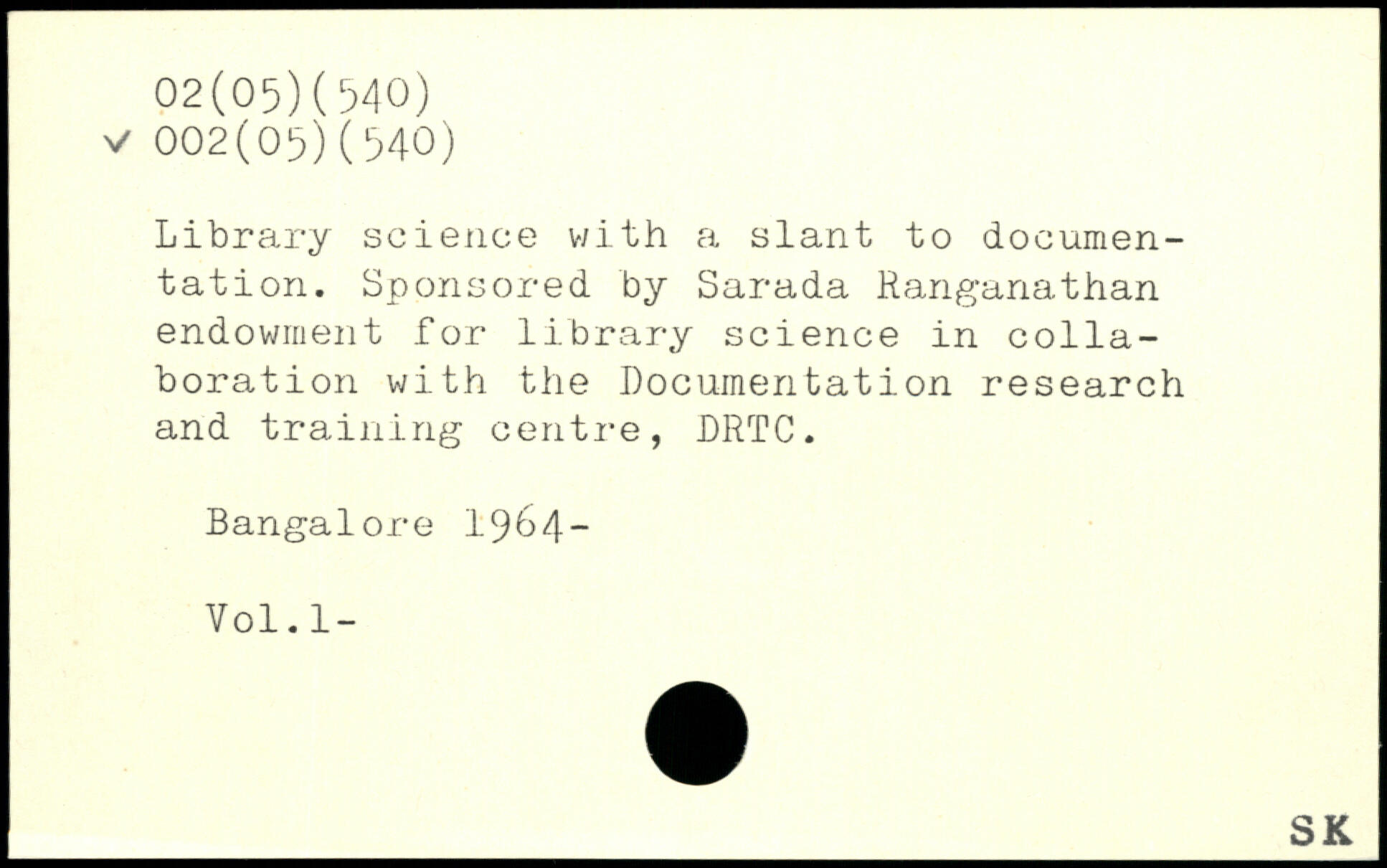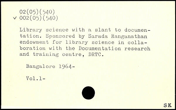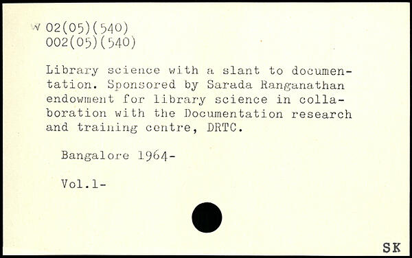 Library science with a slant to documentation. Sponsored by Sarada Ranganathan endowment for library science in collaboration with the Documentation research and training centre, DRTC.
