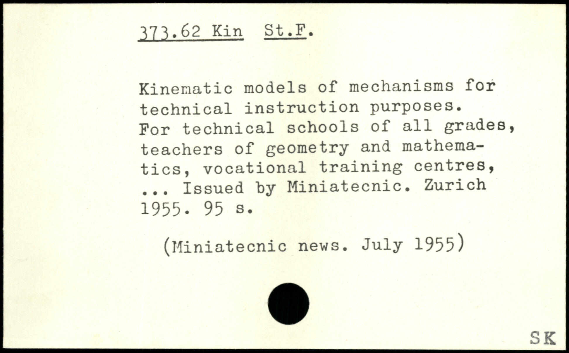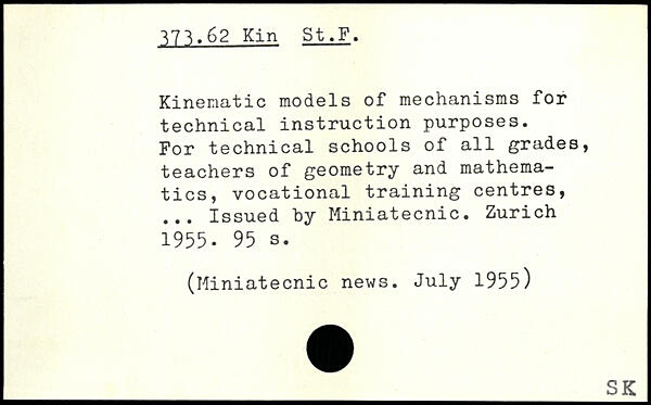 Kinematic models of mechanisms for technical instruction purposes. For technical schools of all grades, teachers of geometry and mathematics, vocational training centres, ... Issued by Miniatecnic. Zurich 1955.