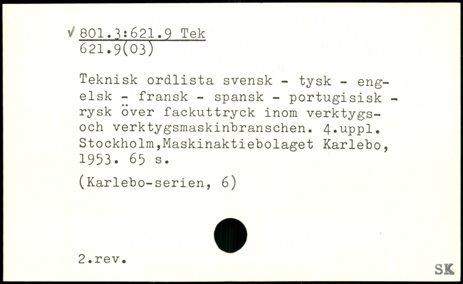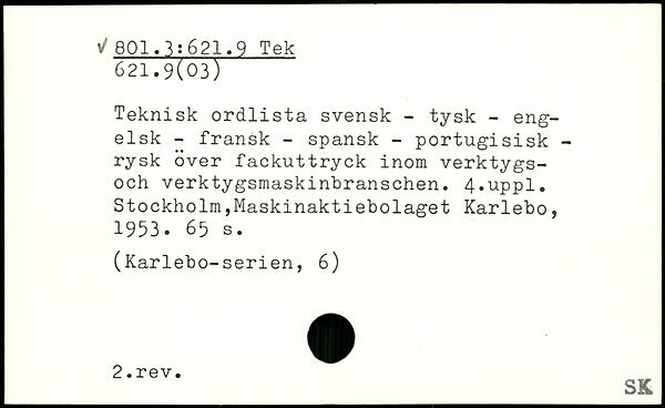 Teknisk ordlista svensk - tysk - engelsk - fransk - spansk - portugisisk -rysk over fackuttryck inom verktygs-och verktygsmaskinbranschen.