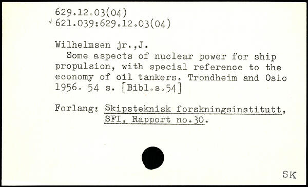 Vilhelmsen jr,,J. Some aspects of nuclear power for ship propulsion, with special reference to the economy of oil tankers. Trondheim and Oslo 1956o