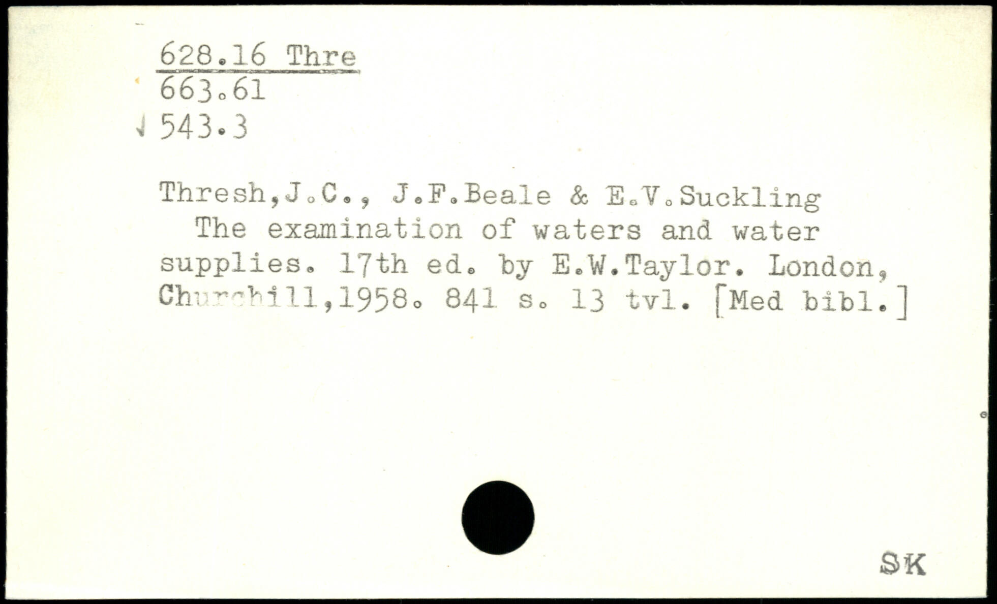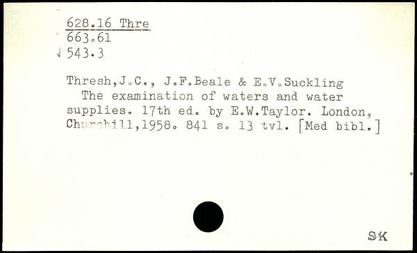 Thresh, Jo C. , J'eF,Beale & EeY0Suckling The examination of waters and water supplies, 17th ed. by E.W.Taylor. London, Chur"bl11,19580 84I So 13 tv1, [Med bibl.]