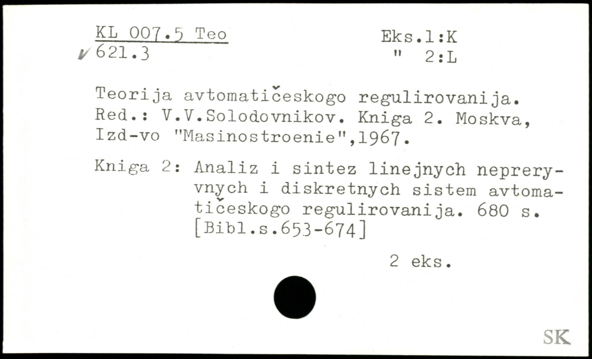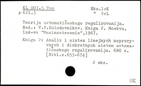 Teorija avtomaticeskogo regulirovanija. Red.: V. V.Solodovnikov. Kniga 2. Moskva, Izd-vo ”Masinostroenie",1967. Kniga 2: Analiz i sintez linejnych neprery-vnych i diskretnych sistem avtoma-ticeskogo regulirovanija.