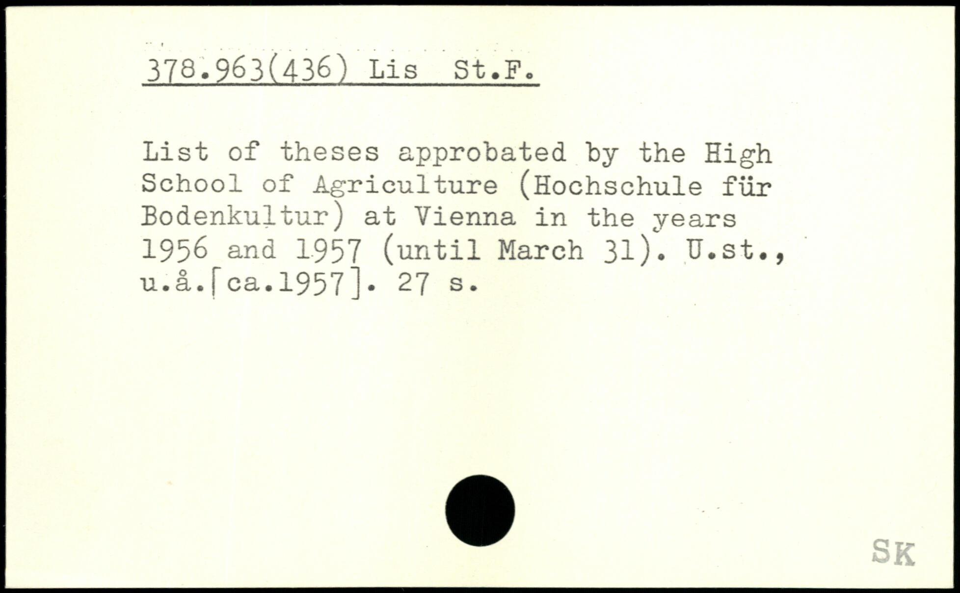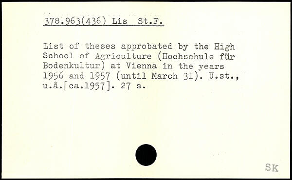 List of theses approbated by the High School of Agriculture (Hochschule für Bodenkultur) at Vienna in the years 1956 and 1957 (until March 31). TJ.st., u.a. [ca.1957].