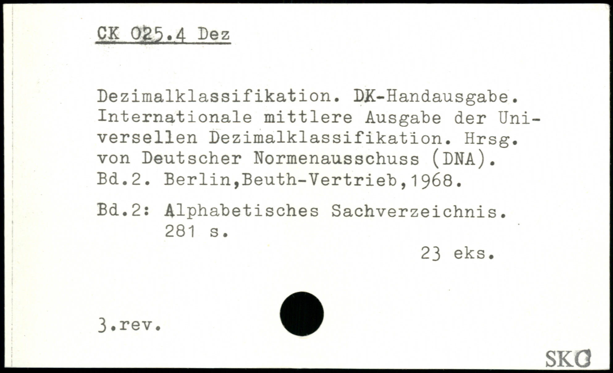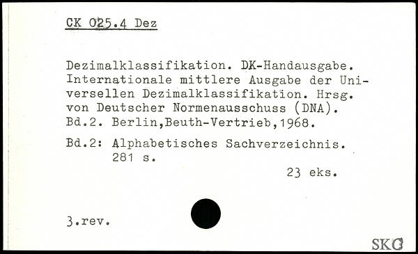 Dezimalklassifikation. DK-Handausgabe. Internationale mittlere Ausgabe der Universellen Dezimalklassifikation. Hrsg, von Deutscher Normenausschuss (DNA).