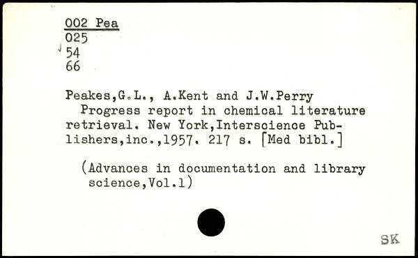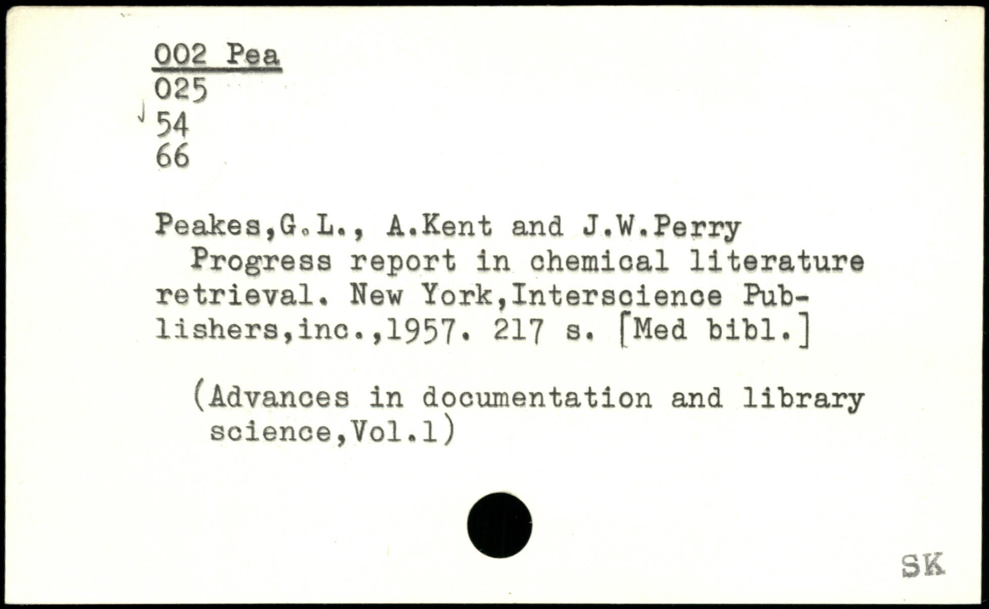 Progress report in chemioal literature retrieval. New York,Intersoienoe Publishers, inc. ,1957