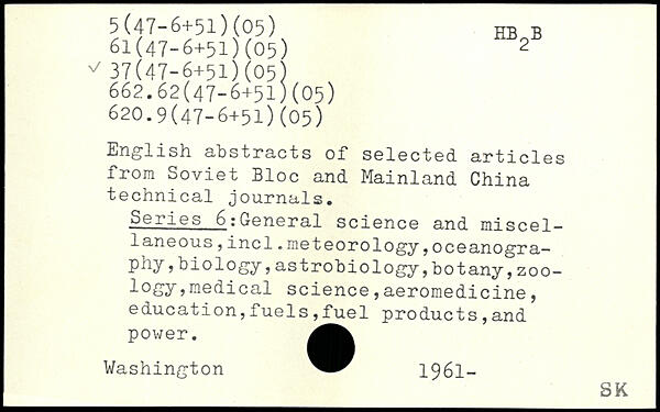 English abstracts of selected articles from Soviet Bloc and Mainland China technical journals. Series 6:General science and miscellaneous ,incl.meteorology,oceanography ,biology,astrobiology,botany,zoo-logy,medical science,aeromedicine, education,fuels,fuel products,and power.
