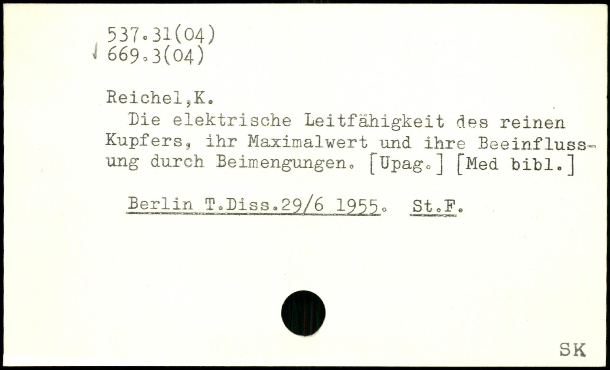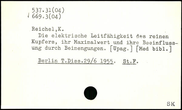 Die elektrische Leitfähigkeit des reinen Kupfers, ihr Maximalwert und ihre Beeinflussung durch Beimengungen, [üpago] [Med hihi,] Berlin T,Diss.29/6 1955c St.F.