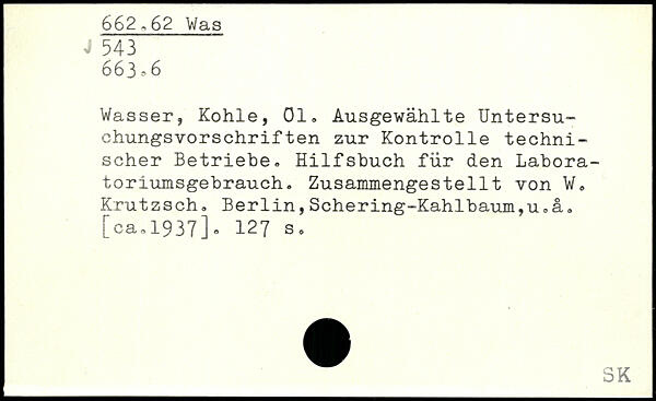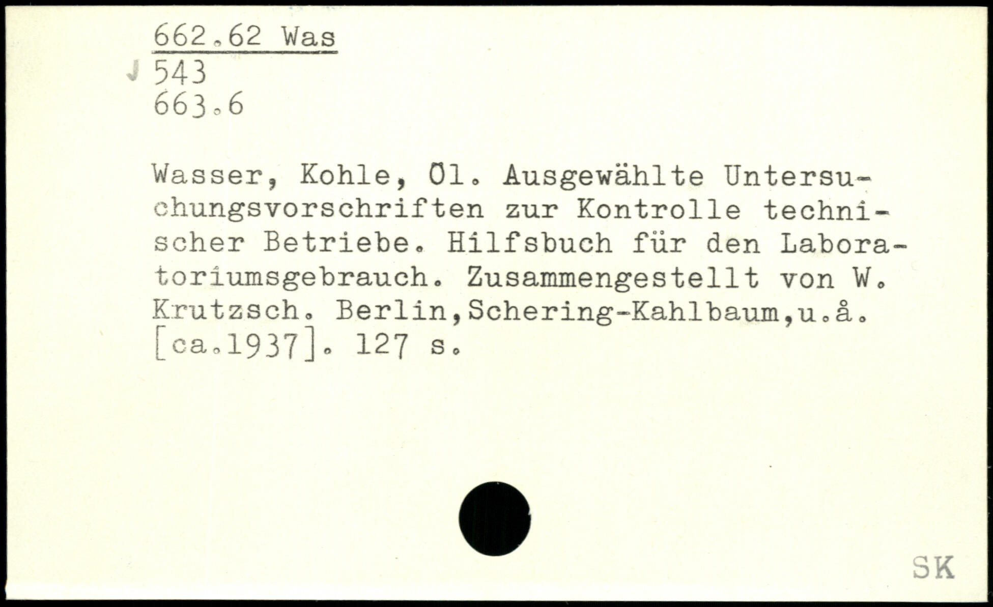 Wasser, Kohle, 01. Ausgewählte Untersu-chungsvorschriften zur Kontrolle technischer Betriebe. Hilfsbuch für den Laboratoriumsgebrauch. Zusammengestellt von W. Krutzsch. Berlin,Schering-Kahlbaum,u.ä.