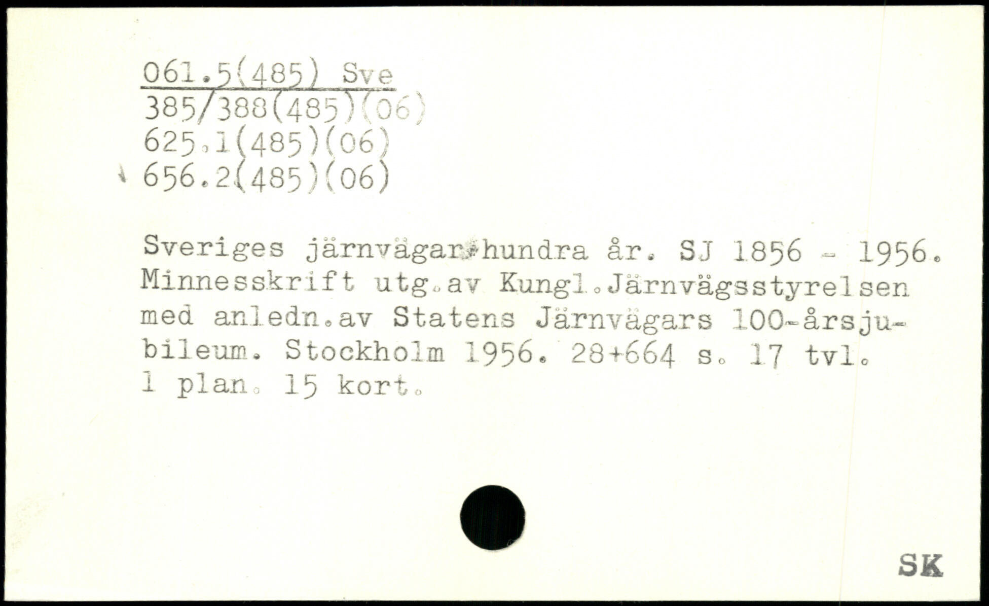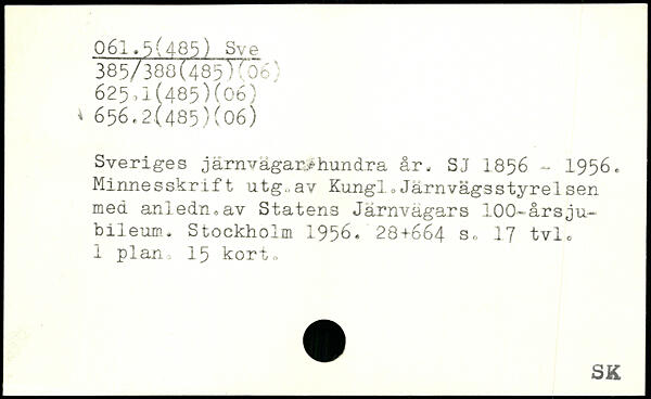 Sveriges järnvågar>hundra år, SJ 1856 - 1956. Minnesskrift utg,av Kunglo Järnvägsstyrelsen med anledn, av Statens Järnvägars 100-årsjubileum.