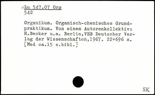 Organikum. Organisch-chemisches Grund-praktikum. Von einem Autorenkollektivs H.Becker u.a. Berlin,VEB Deutscher Verlag der Wissenschaften,1967.