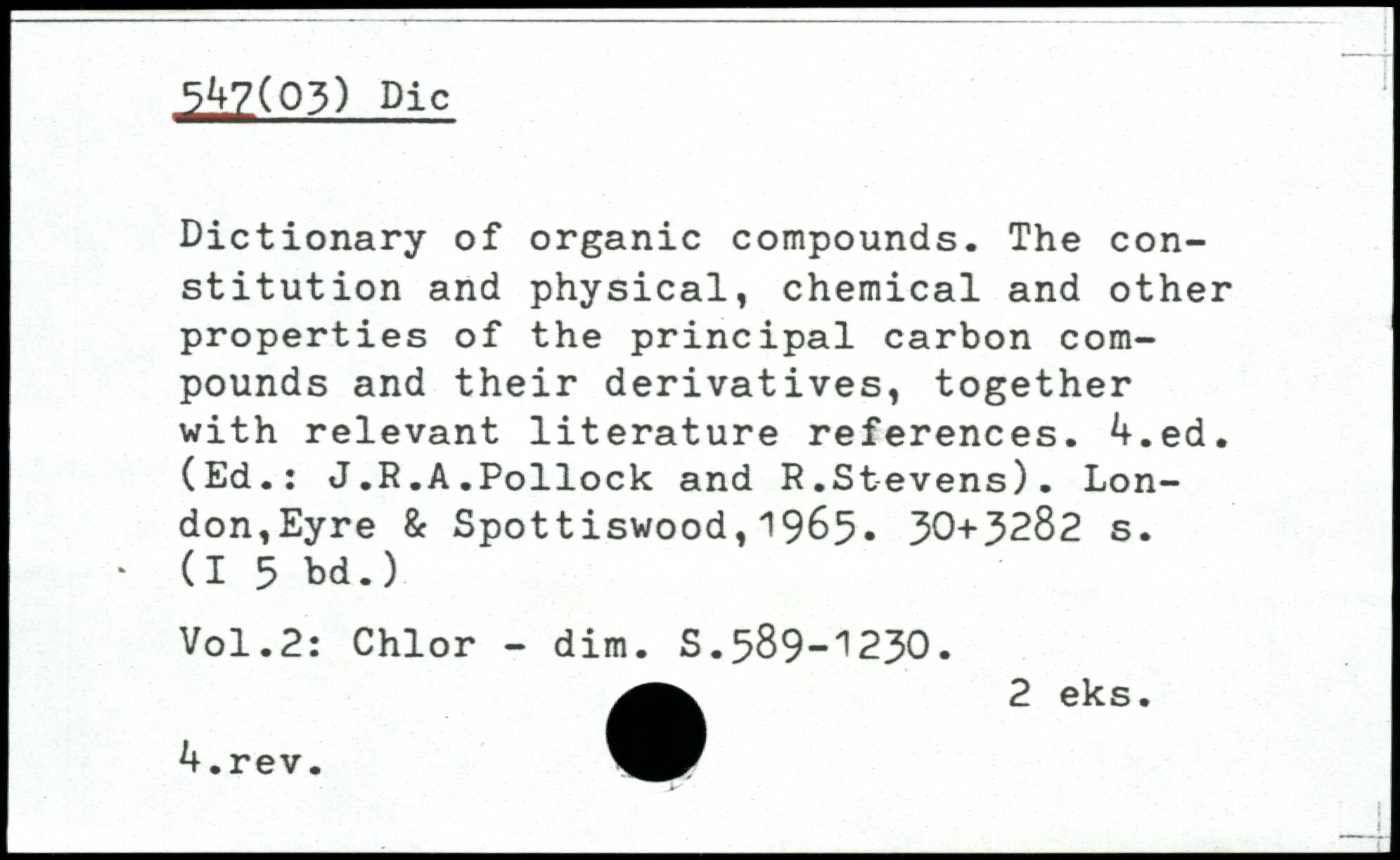 Dictionary of organic compounds. The constitution and physical, chemical and other properties of the principal carbon compounds and their derivatives, together with relevant literature references, k.ed. (Ed.: J .R.A.Pollock and R.Stevens).