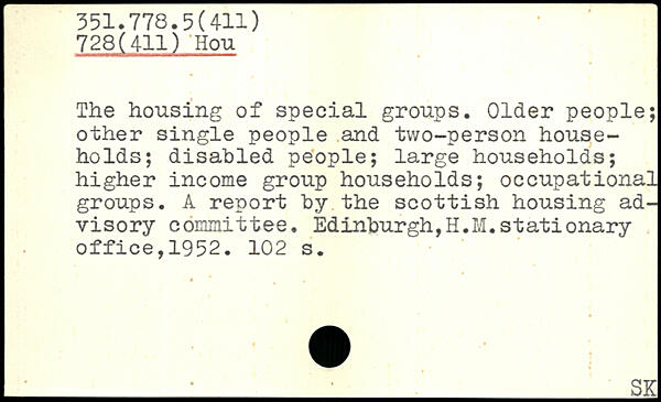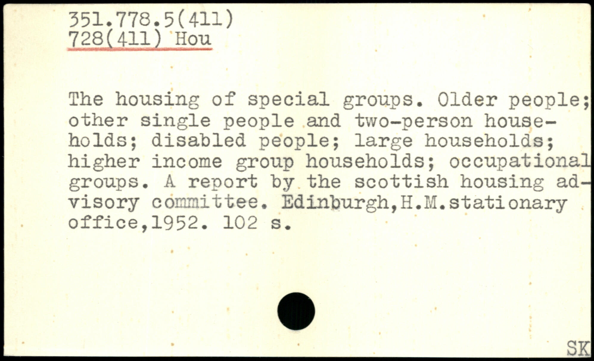 The housing of special groups. Older people; other single people .and two-person households; disabled people; large households; higher income group households; occupational groups. A report by the Scottish housing advisory committee. Edinburgh,H.M.stationary office,1952.