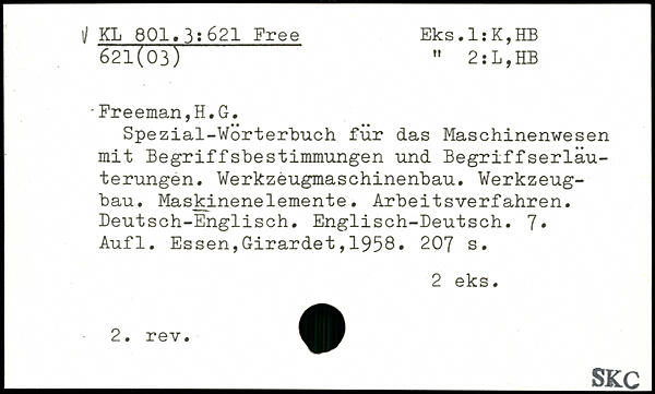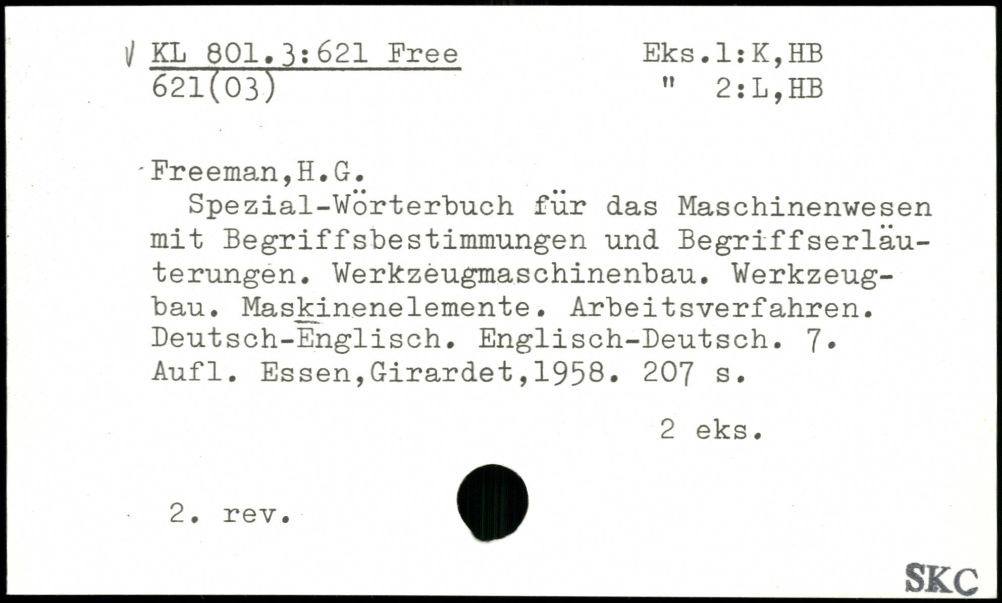 Spezial-Worterbuch für das Maschinenwesen mit BegriffsbeStimmungen und Begriffserläu-terungen. Werkzeugmaschinenbau. Werkzeugbau. Maskinenelernente. Arbeitsverfahren. Deutsch-Englisch. Englisch-Deutsch.