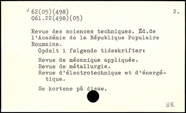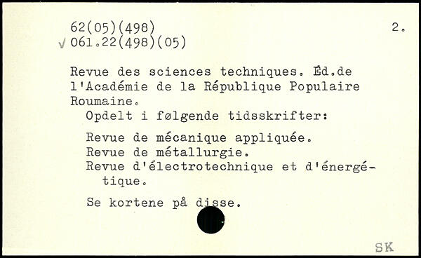 Revue des sciences techniques, Ëd.de l’Académie de la République Populaire Roumaine, Opdelt i følgende tidsskrifter: Revue de mécanique appliquée. Revue de métallurgie. Revue d'électrotechnique et d’énergétique O Se kortene på ^^^e.