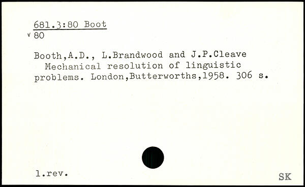 Booth,A.D., L.Brandwood and J.P.Cleave Mechanical resolution of linguistic problems.