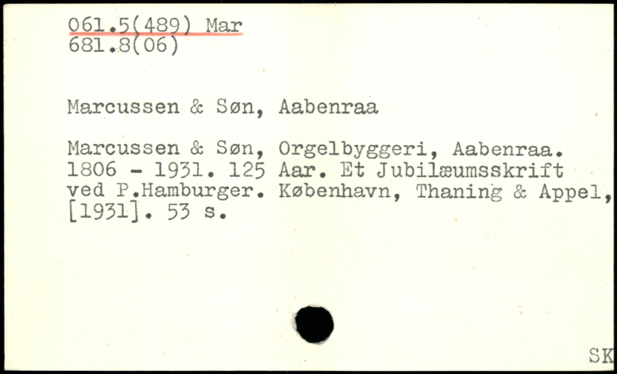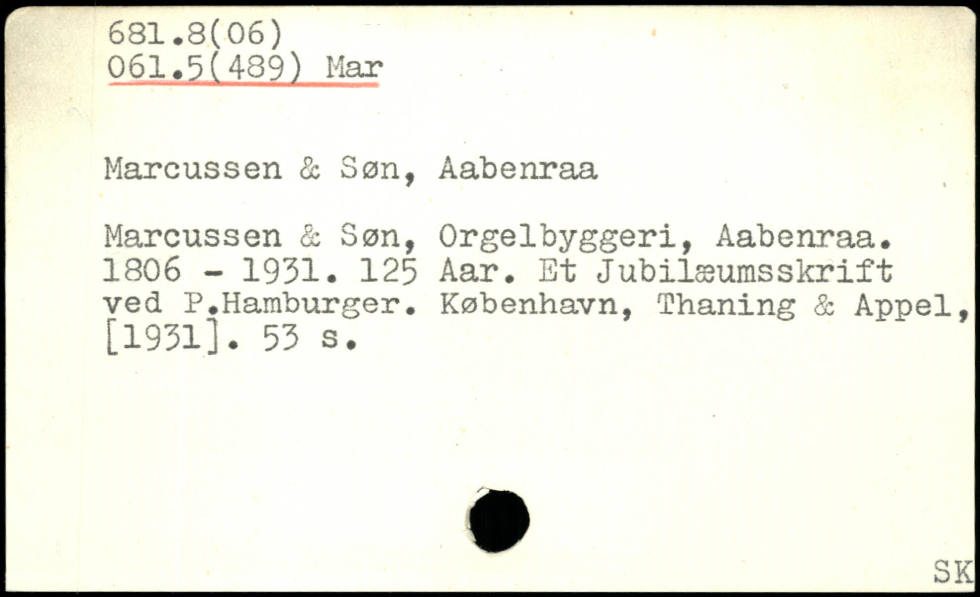 Marcussen & Søn, Aabenraa Marcussen & Søn, Orgelbyggeri, Aabenraa. 1806 - 1931. 125 Aar. Et Jubilæumsskrift ved P.Hamburger.