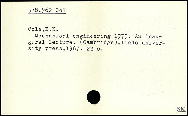 Mechanical engineering 1975, An inaugural lecture. (Cambridge),Leeds university press,1967.