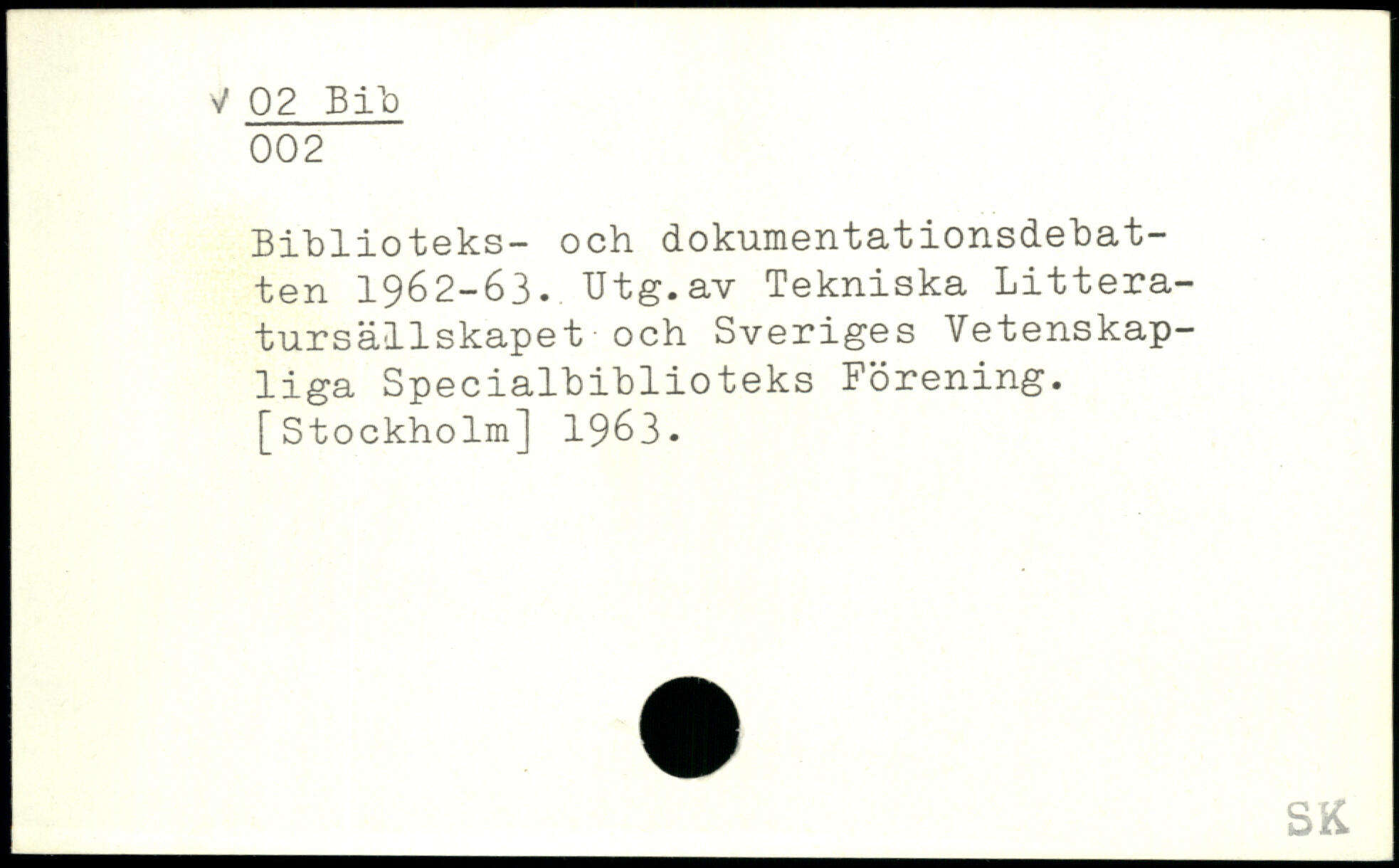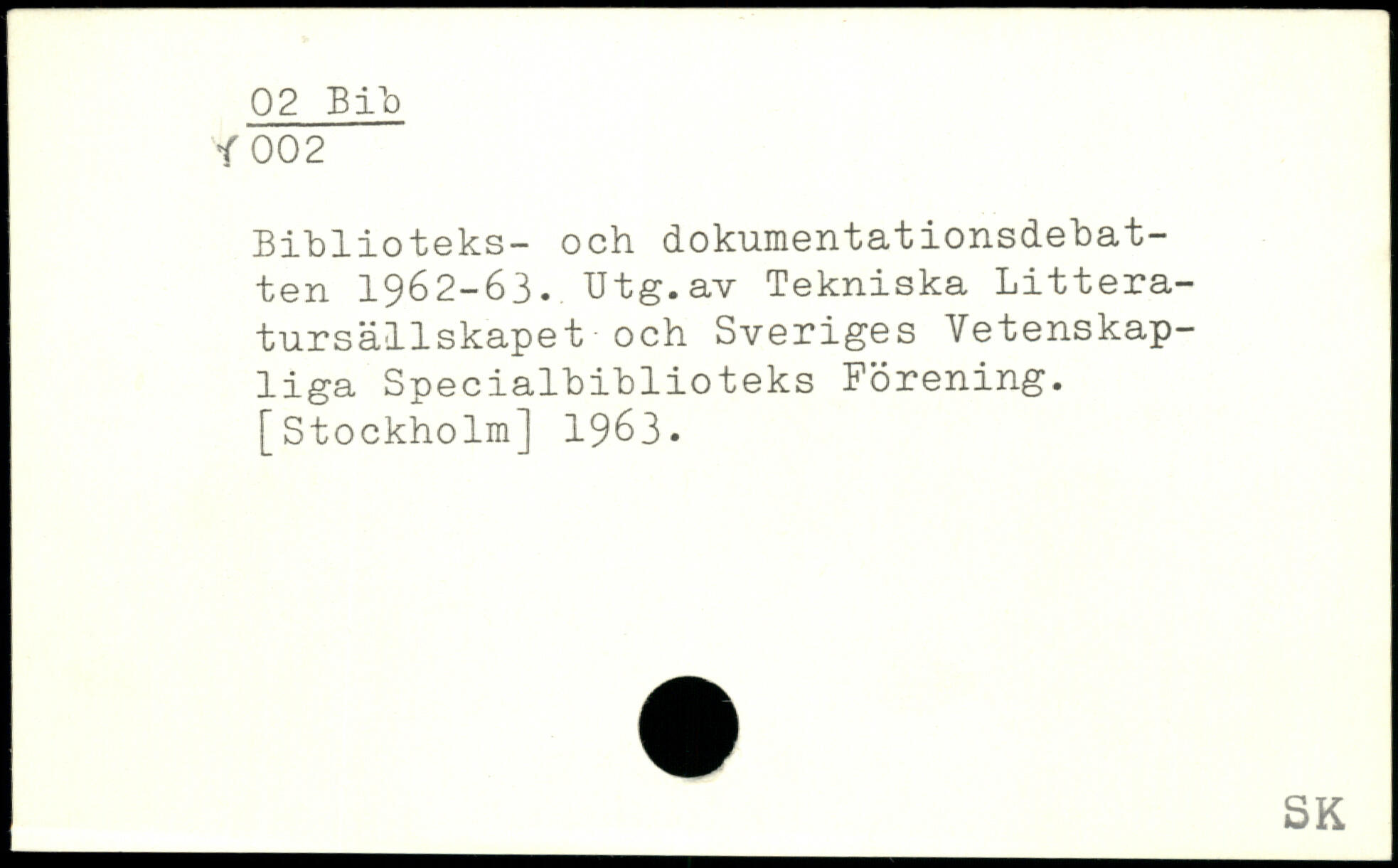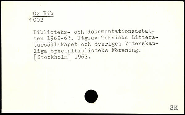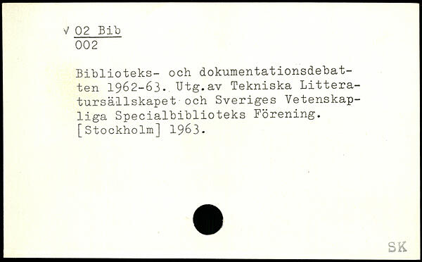 Biblioteks- och dokumentationsdebat-ten 1962-63. Utg.av Tekniska Litteratursällskapet och Sveriges Vetenskapliga Specialbiblioteks Förening.
