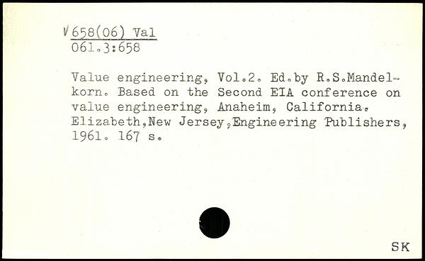 Value engineering, Vo1020 Ed,by RoS0Mandel~ korn, Based on the Second E1A conference on value engineering, Anaheim, California.