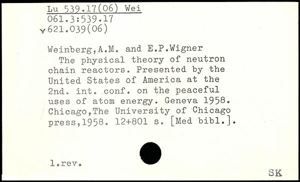 Weinberg,A.M. and E.P.Wigner The physical theory of neutron chain reactors. Presented by the United States of America at the 2nd. int. conf. on the peaceful uses of atom energy.