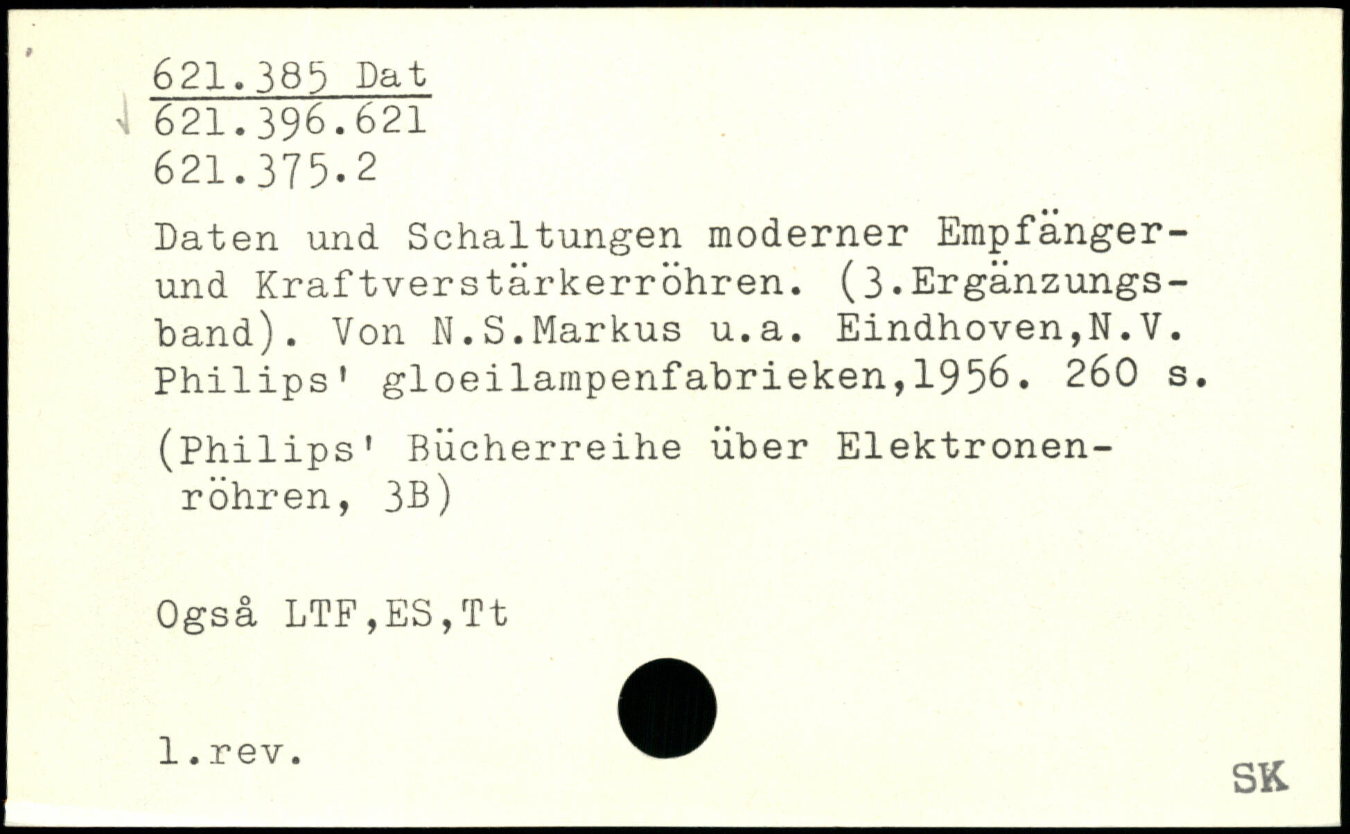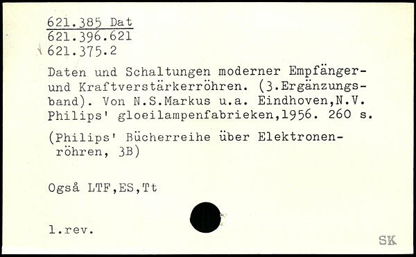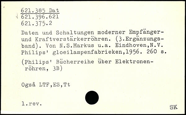 Daten und Schaltungen moderner Empfängerund Kraftverstärkerröhren. (3.Ergänzungsband). Von N.S.Markus u.a. Eindhoven,N.V. Philips. gloeilampenfabrieken,1956.