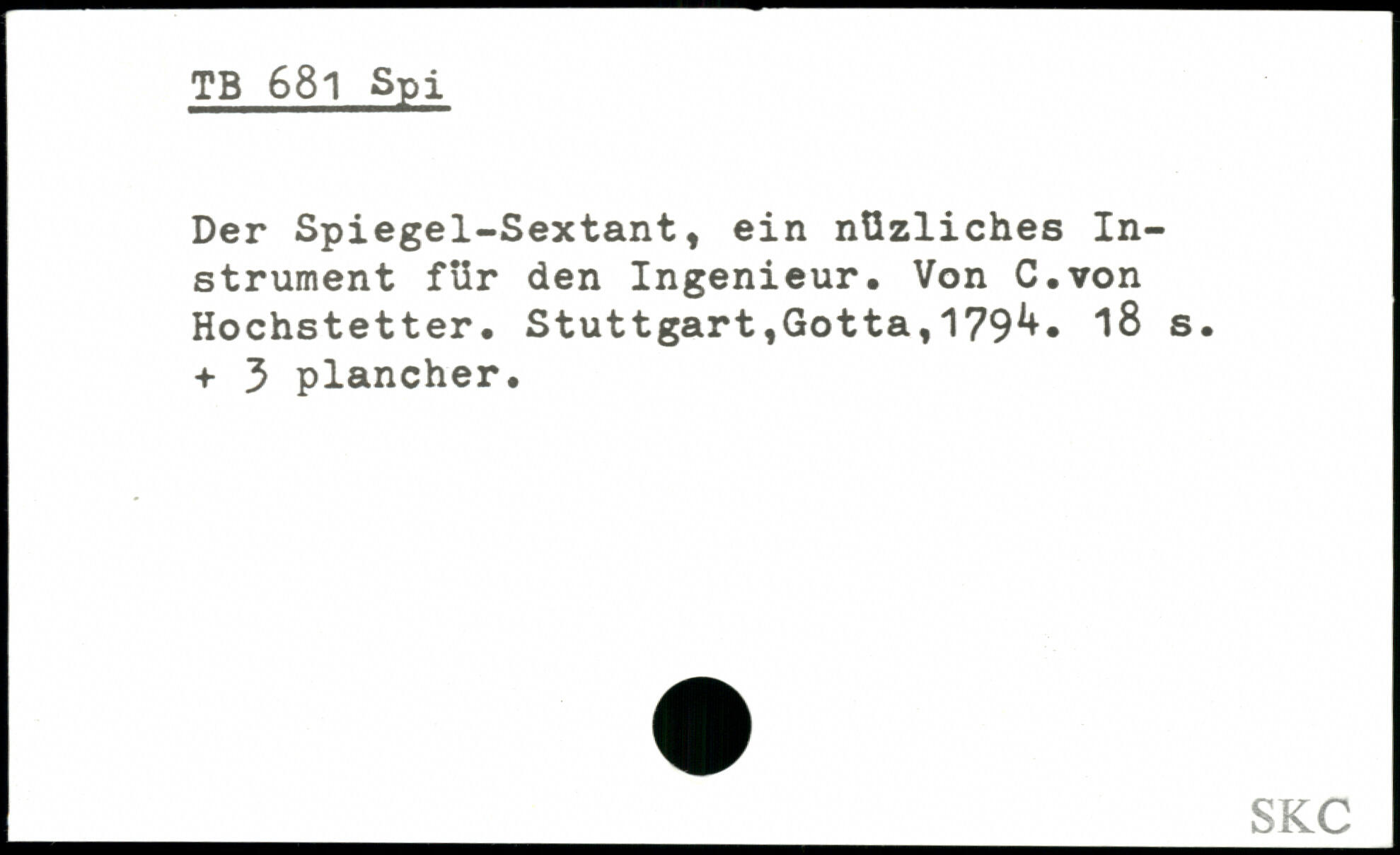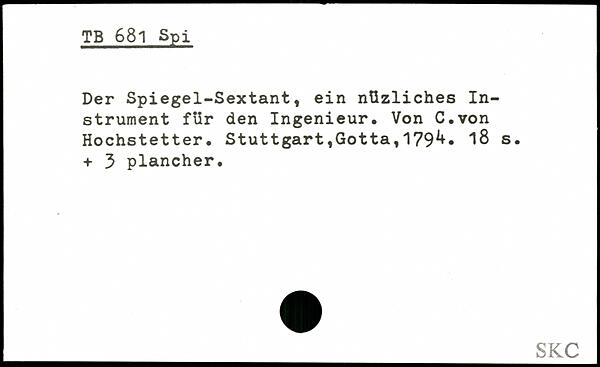Der Spiegel-Sextant, ein nüzliches Instrument für den Ingenieur. Von C.von Hochstetter. Stuttgart,Gotta,179^. “iß s. + 3 plancher.
