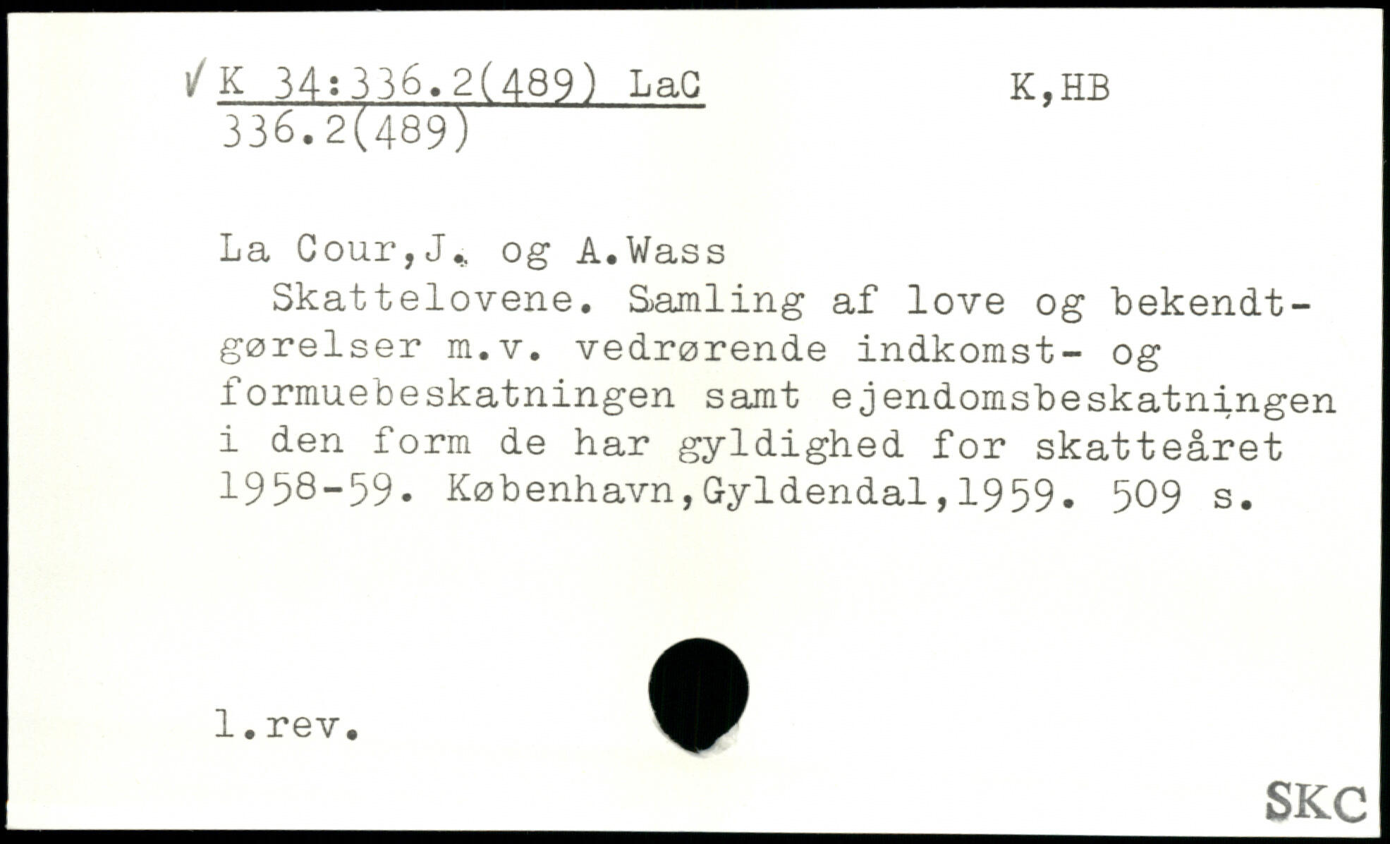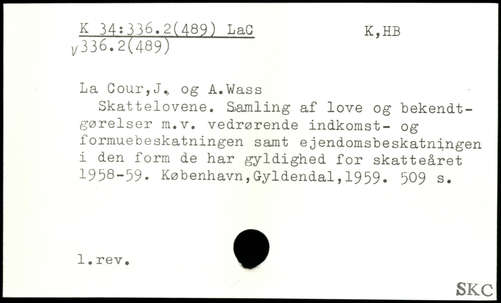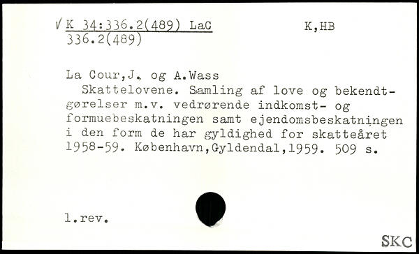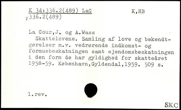 La Cour,J., og A.Wass Skattelovene. Samling af love og bekendtgørelser m.v. vedrørende indkomst- og formuebeskatningen samt ejendomsbeskatningen i den form de har gyldighed for skatteåret 1958-59.