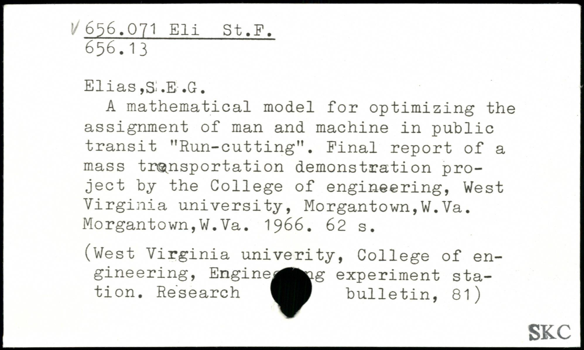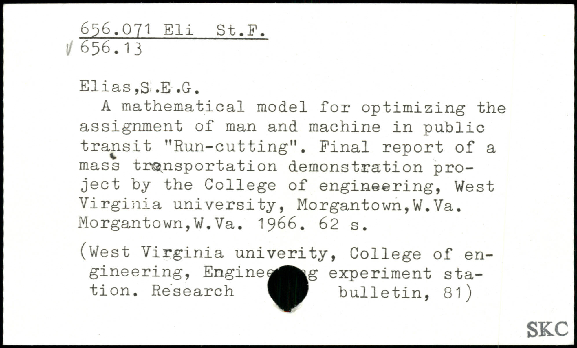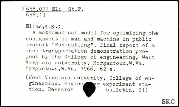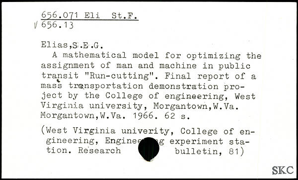 Elias, Si.E-.G. A mathematical model for optimizing the assignment of man and machine in public transit "Run-cutting". Final report of a mass transportation demonstration project by the College of engineering, West Virginia university, Morgantown,W.Va. Morgantown,W.Va. 1966.