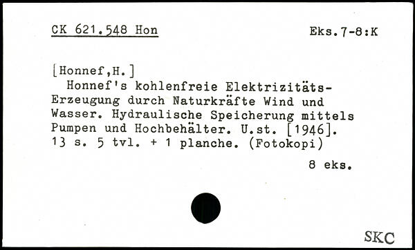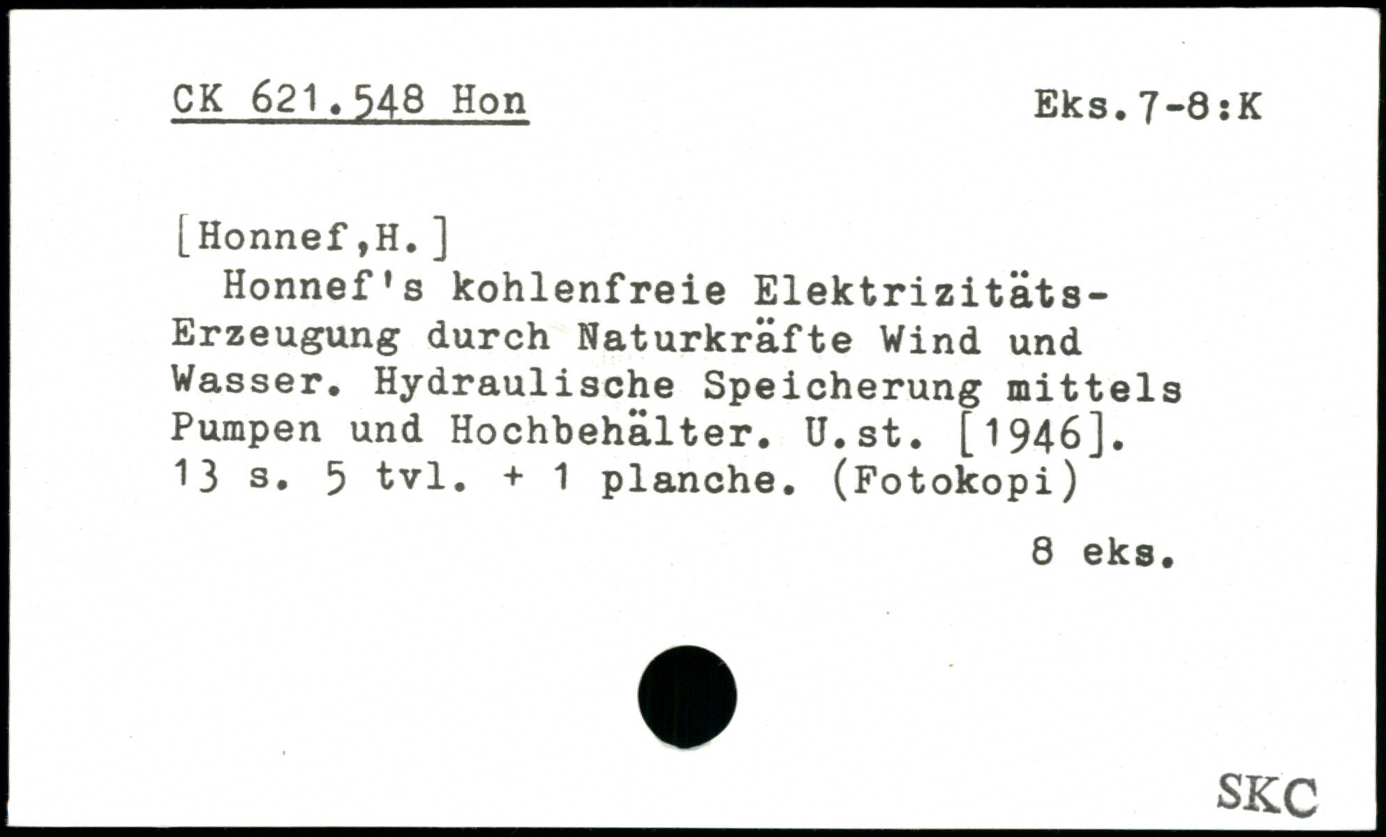 Honnef's kohlenfreie Elektrizitäts-Erzeugung durch Naturkräfte Wind und Wasser. Hydraulische Speicherung mittels Pumpen und Hochbehälter. U.st.