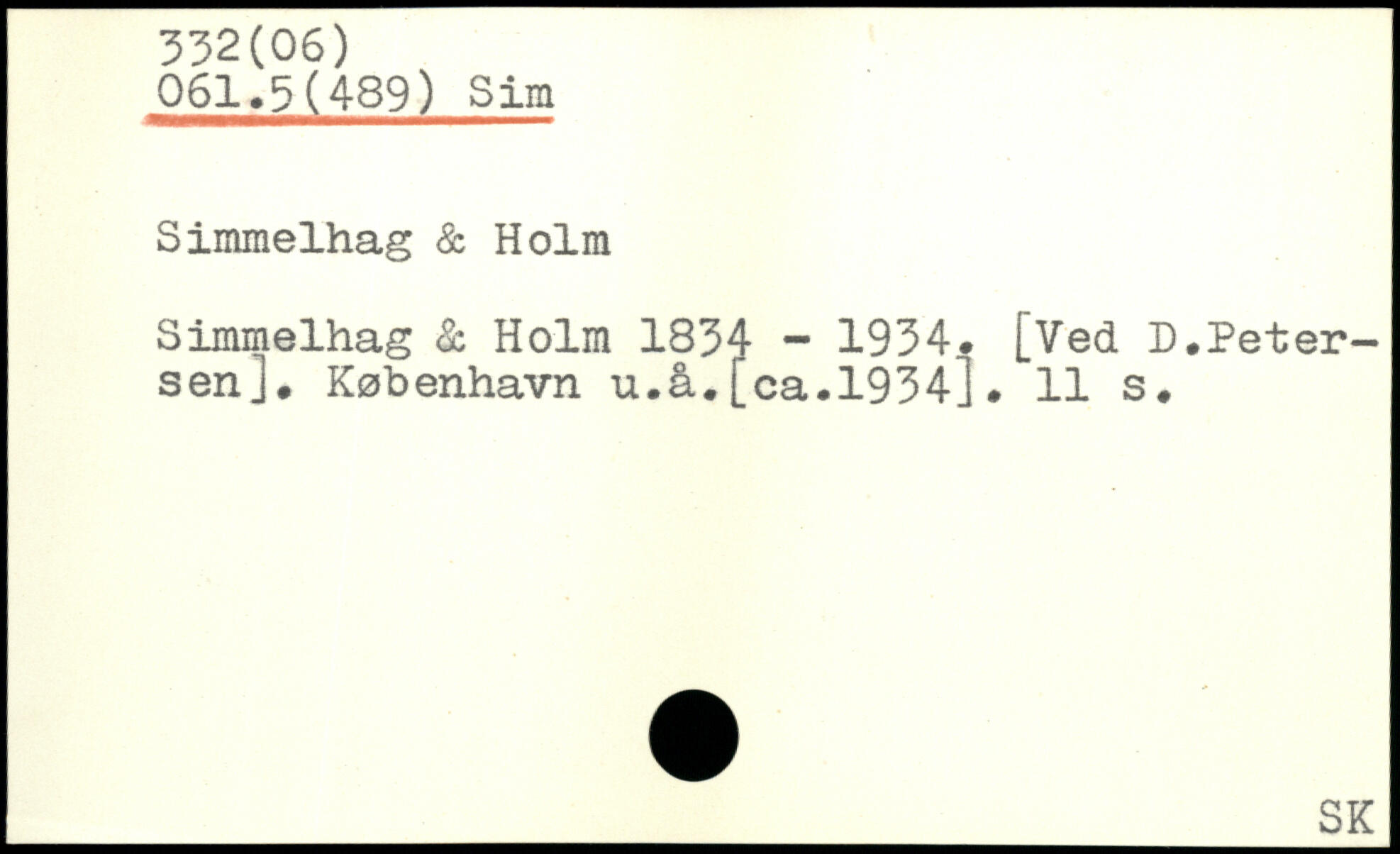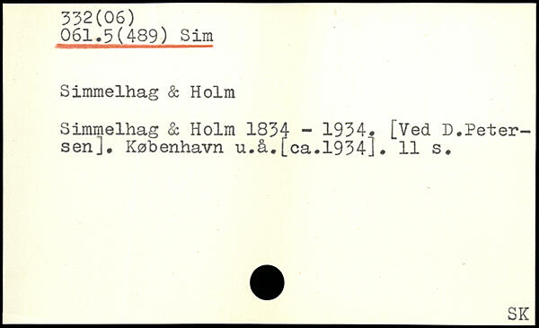 061.3(489) Sim Simmelhag & Holm Simmelhag & Holm 1834 - 1934. [Ved D.Petersen]. København u.å.[ca.1934].