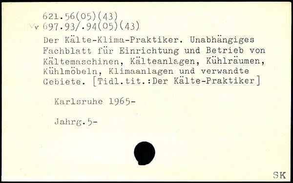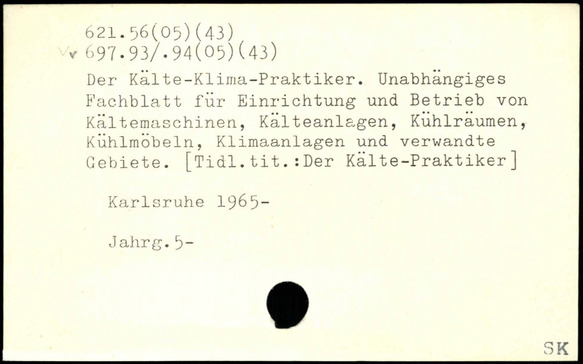 Der Kalte-Klima-Praktiker. Unabhängiges Fachblatt für Einrichtung und Betrieb von Kältemaschinen, Kälteanlagen, Kuhlräumen, i Kühlmöbeln, Klimaanlagen und verwandte Gebiete. [Tidl.tit.:Der Kälte-Praktiker] Karlsruhe 1965- Jahrg.