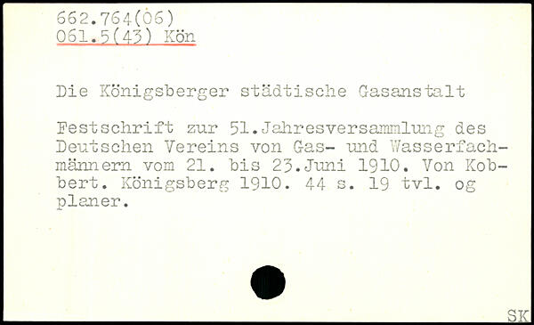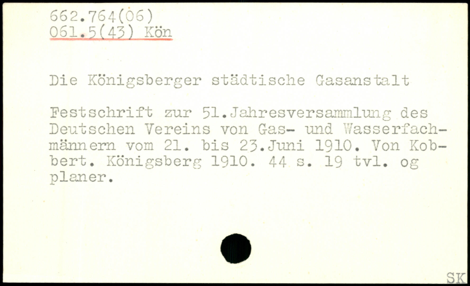 Die Königsberger städtische Gasanstalt Festschrift zur 51.Jahresversammlung des Deutschen Vereins von Gas- und Wasserfach-mänriem vom 21. bis 2.3.Juni 1910. Von Kob-bert. Königsberg 1910.