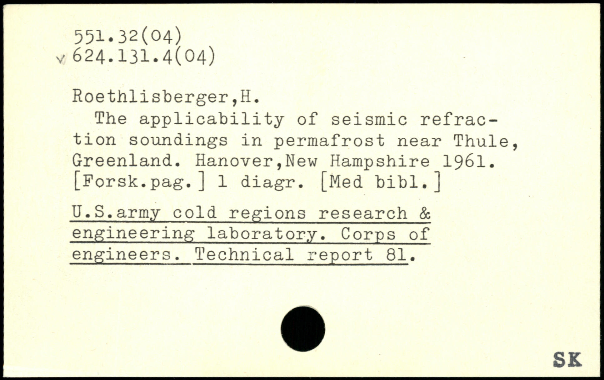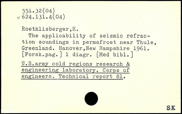 The applicability of seismic refraction soundings in permafrost near Thule, Greenland. Hanover,New Hampshire 1961. [Forsk.pag.] 1 diagr. [Med bibl.] U.S.army cold regions research & engineering laboratory. Corps of engineers. Technical report 81.