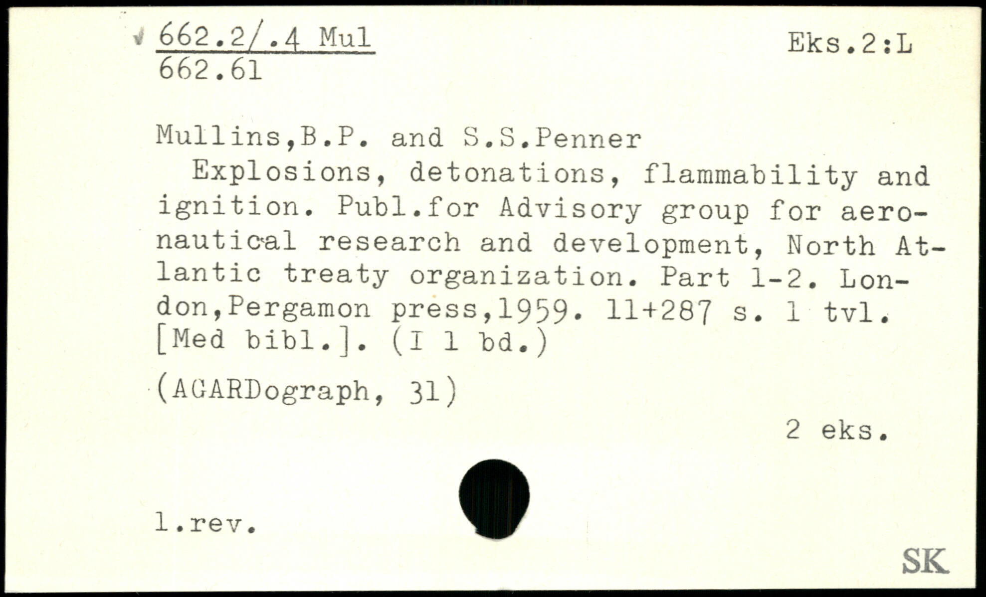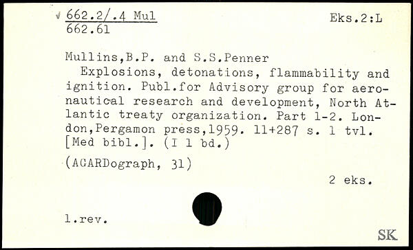 Explosions, detonations, flammability and ignition. Publ.for Advisory group for aeronautical research and development, North Atlantic treaty organization. Part 1-2. Lon- ! don,Pergamon press,1959.