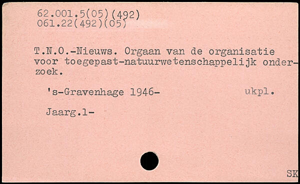 T.N.O.-Nieuws. Orgaan van de organisatie voor toegepast-natuurwetenschappelijk onder-zo ek. ' s-G-ravenhage 1946- ukpl. Jaarg.1-