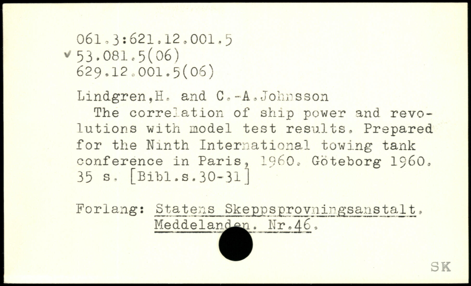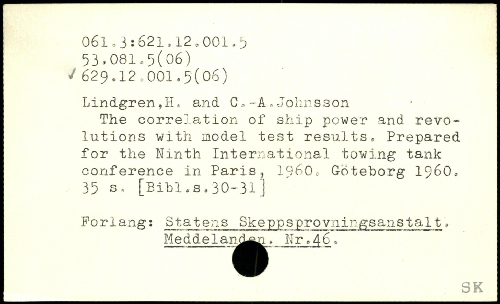 The correlation of. ship power and revolutions with model test results, Prepared for the Ninth International towing tank conference in Paris, 1960, Göteborg 1960
