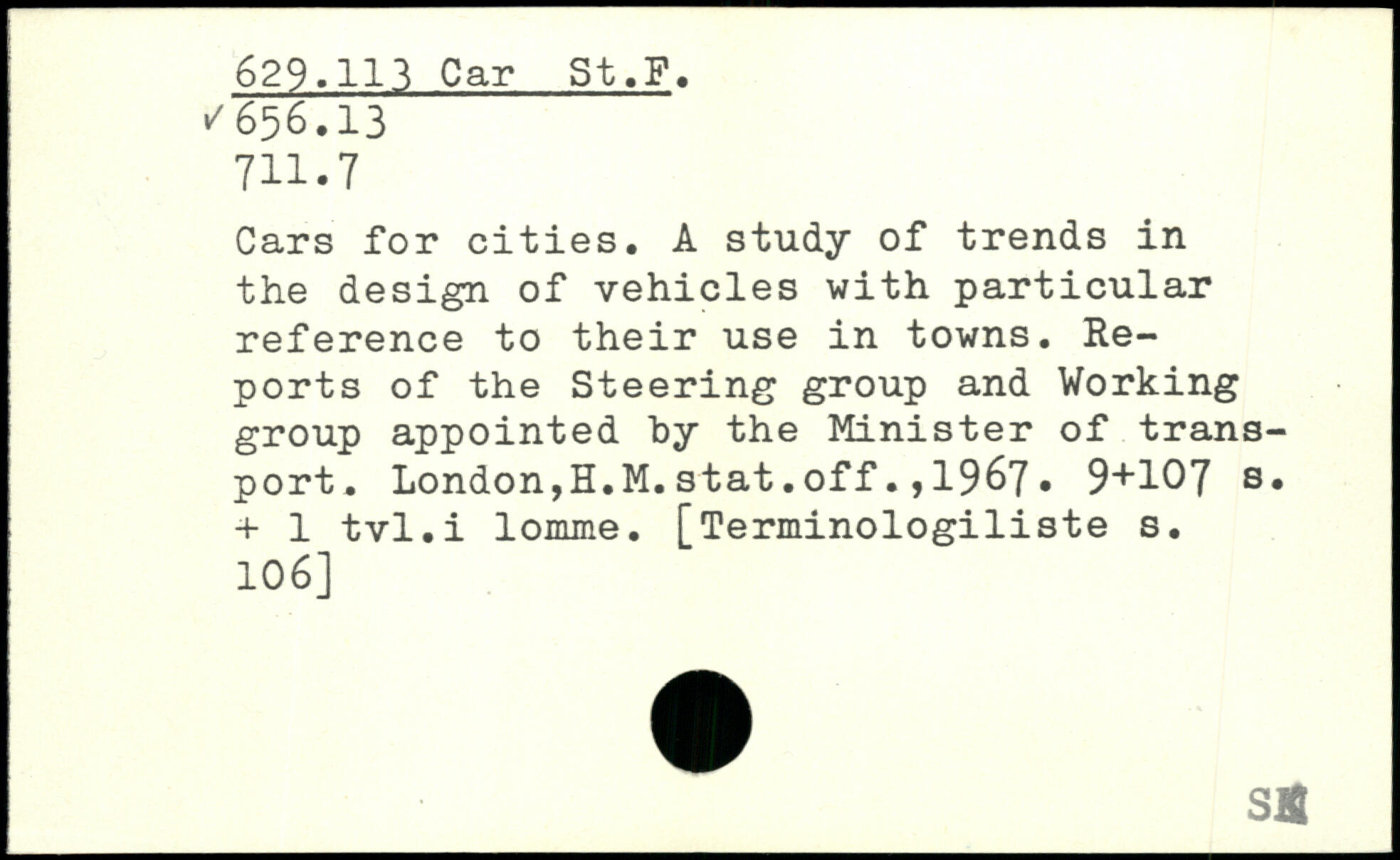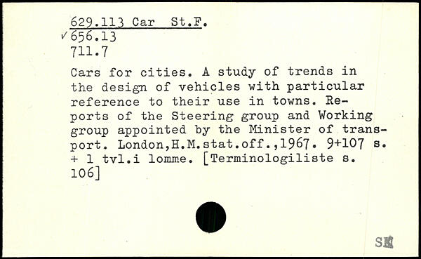 Cars for cities. A study of trends in the design of vehicles with particular reference to their use in towns. Reports of the Steering group and Working group appointed by the Minister of transport. London,H.M.stat.off.,1967.