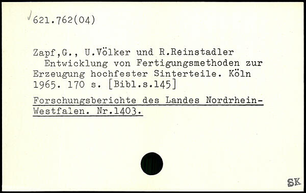 Zapf,G., U.Völker und R.Reinstadler j Entwicklung von Fertigungsmethoden zur Erzeugung hochfester Sinterteile.