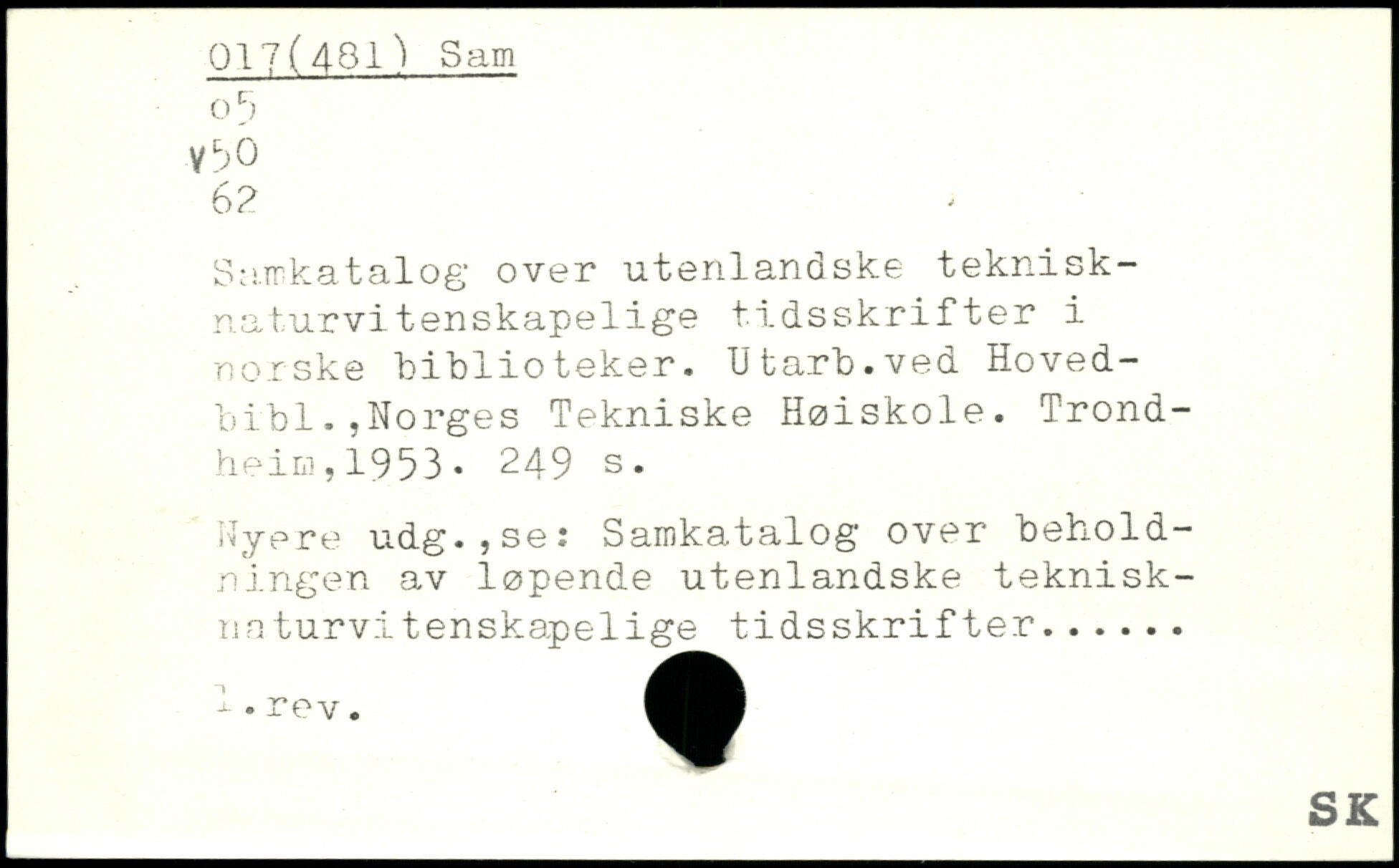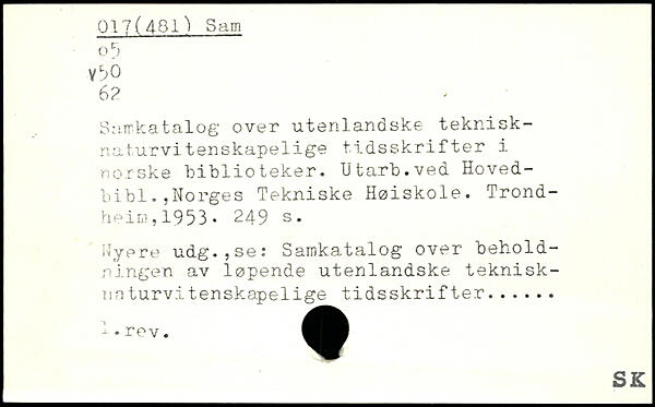 Sairkatalog over utenlandske teknisk-naturvi tenskapelige tidsskrifter i -norske biblioteker. TJtarb.ved Hoved-bibl.,Norges Tekniske Høiskole. Trondheim, 1953.